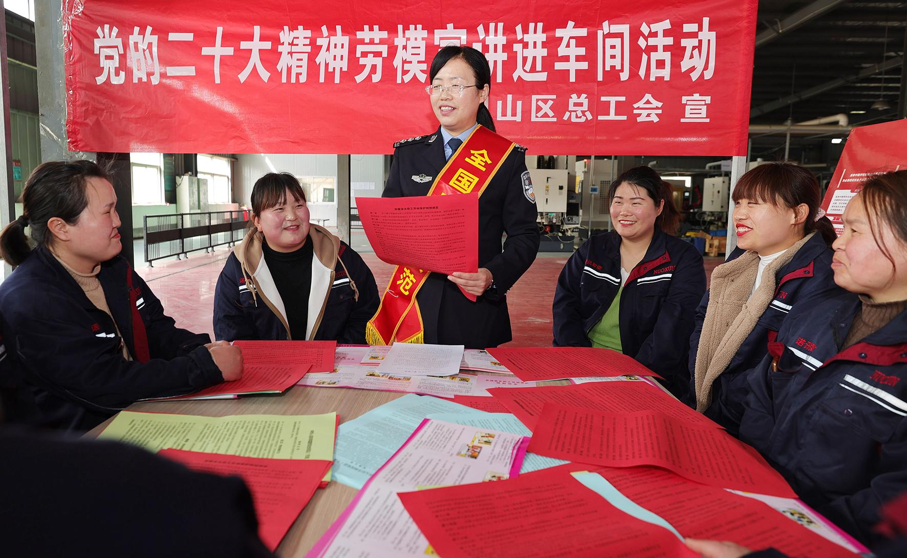 3月7日,安徽省淮北市相山經濟開發(fā)區(qū)企業(yè)生產車間,全國勞動模范、淮北市公安局三堤口派出所所長王懷芬為一線女職工講述立足崗位作貢獻的奮斗故事。