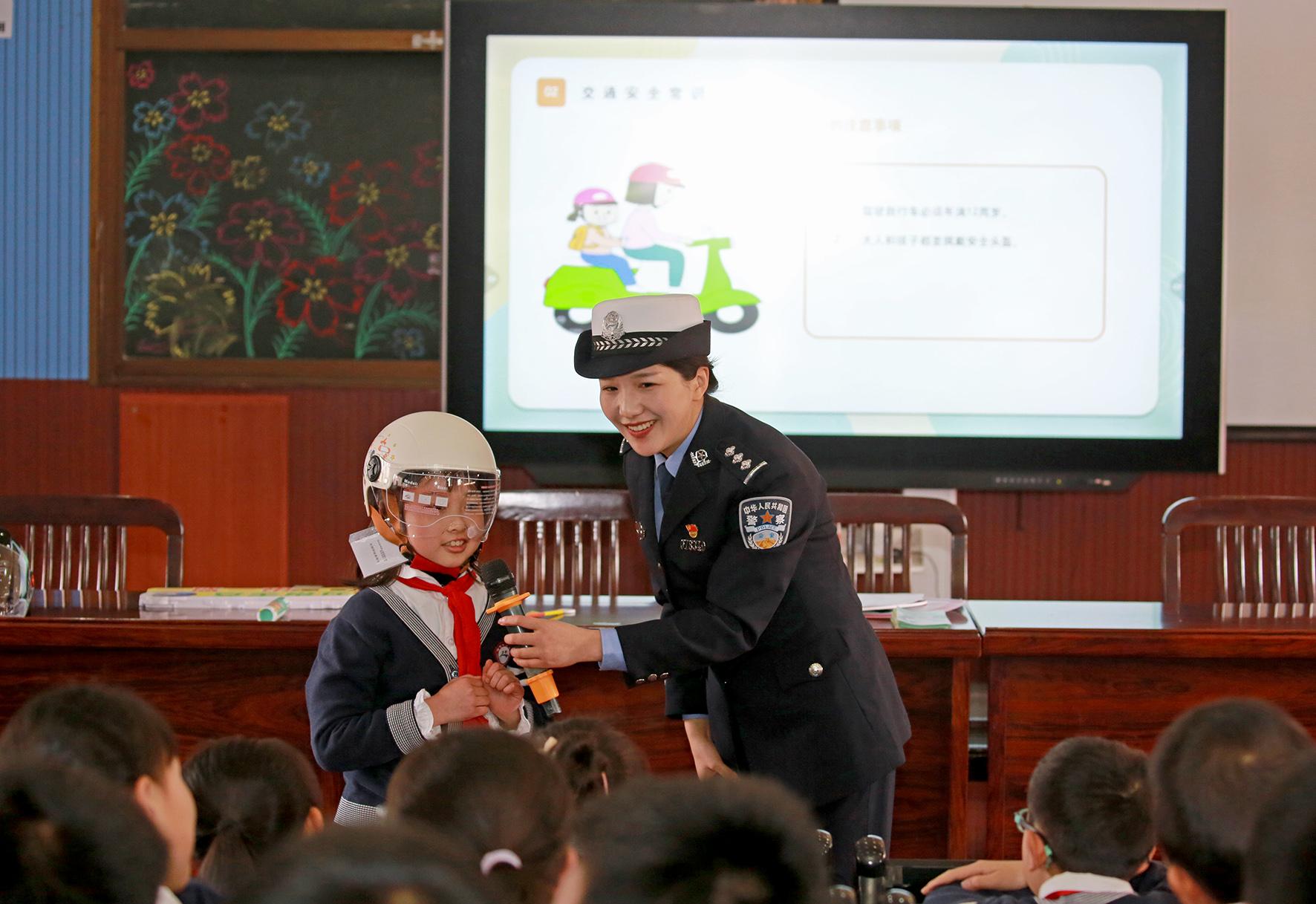圖為揭牌儀式后,鮑雪為同學(xué)們上交通安全課。