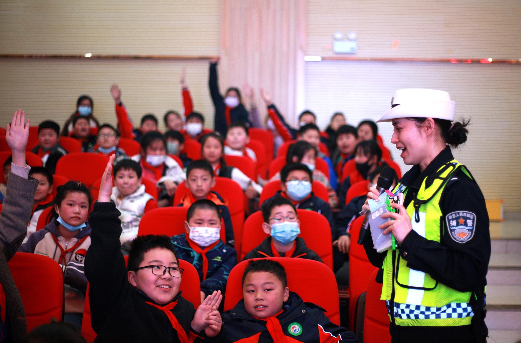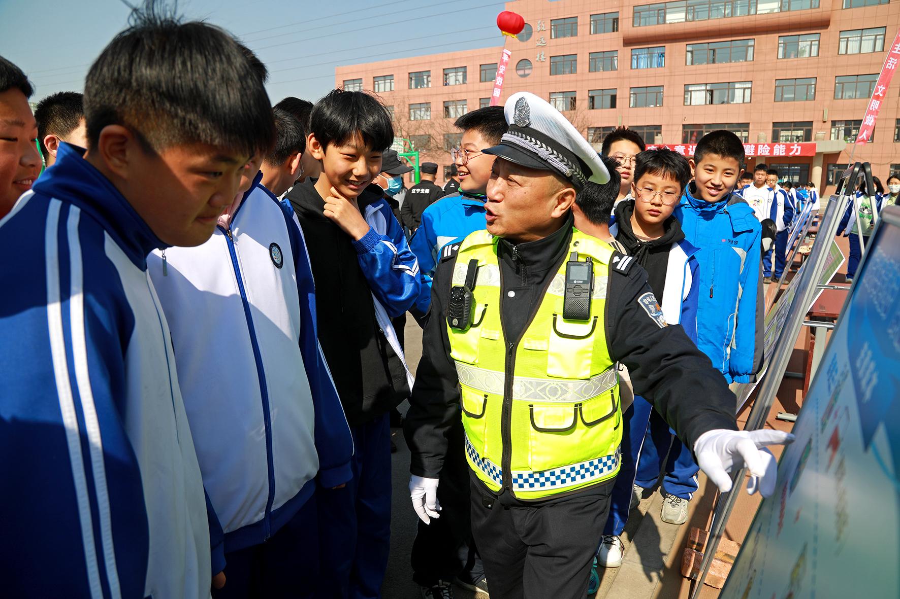 3月28日,遼寧省阜新市公安局交警支隊(duì)民警在“阜新市中小學(xué)生安全教育周啟動(dòng)儀式暨太平區(qū)現(xiàn)場(chǎng)觀摩會(huì)”講解交通安全知識(shí)。