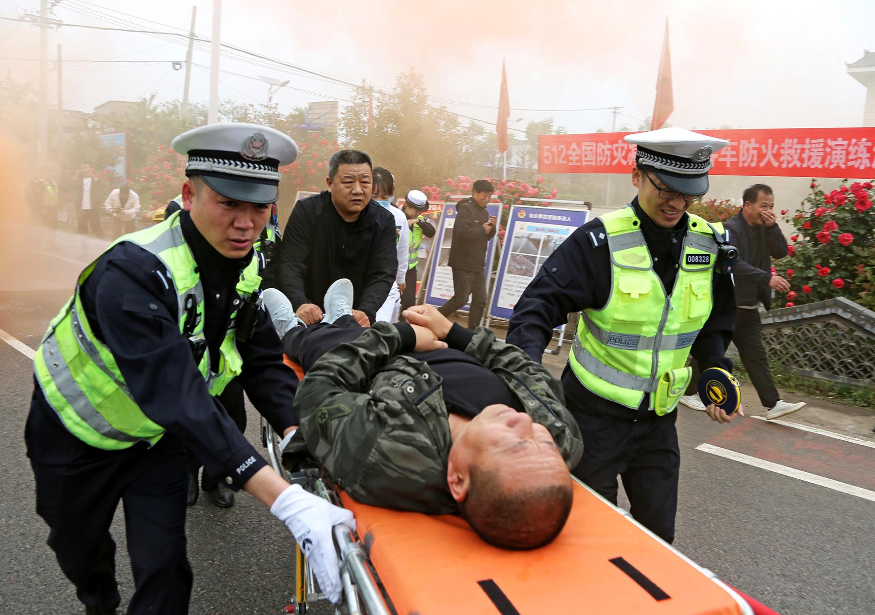 5月10日,陜西省渭南市公安局交警支隊(duì)臨渭大隊(duì)聯(lián)合消防、衛(wèi)生等部門(mén)開(kāi)展客車(chē)滅火救援演練。