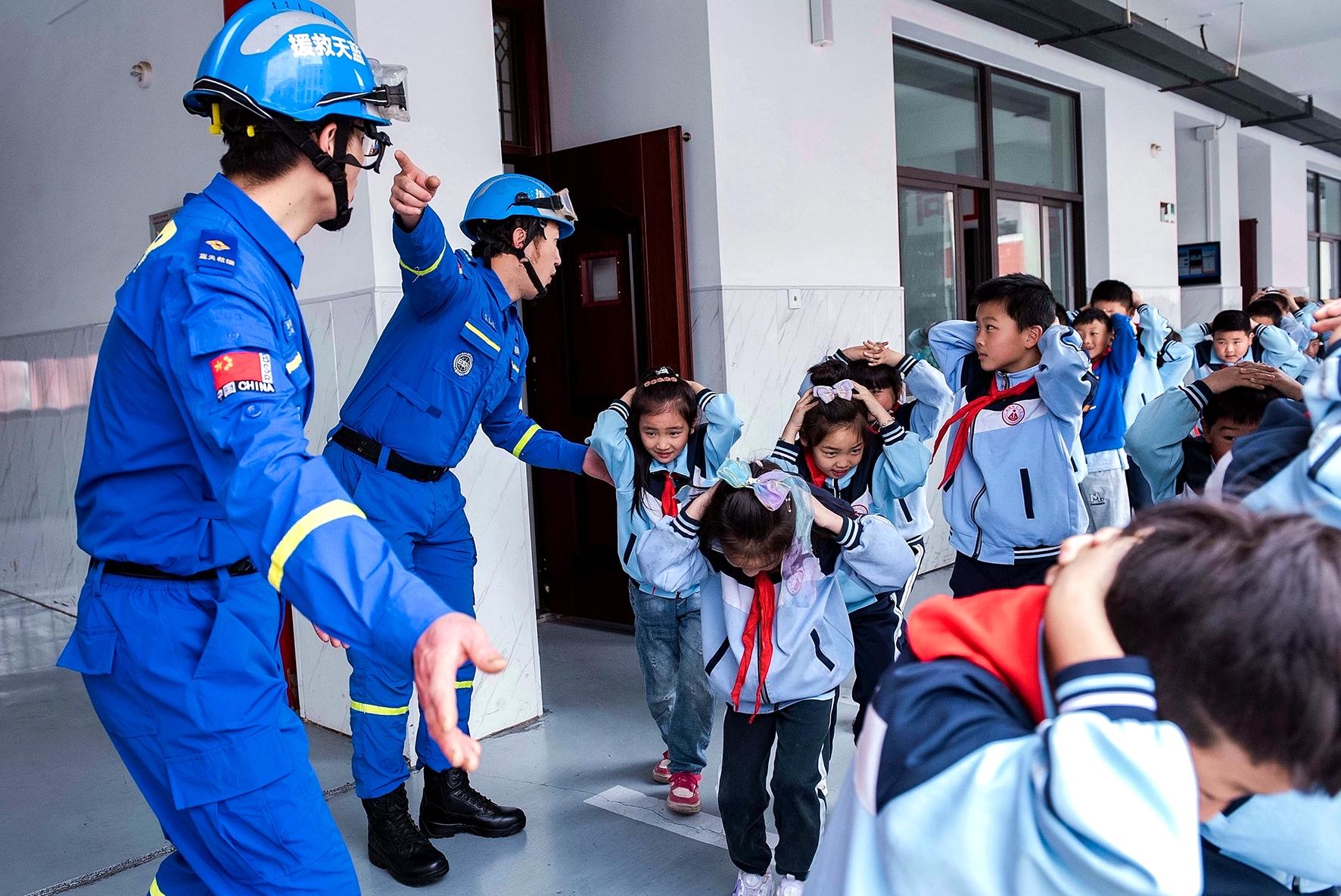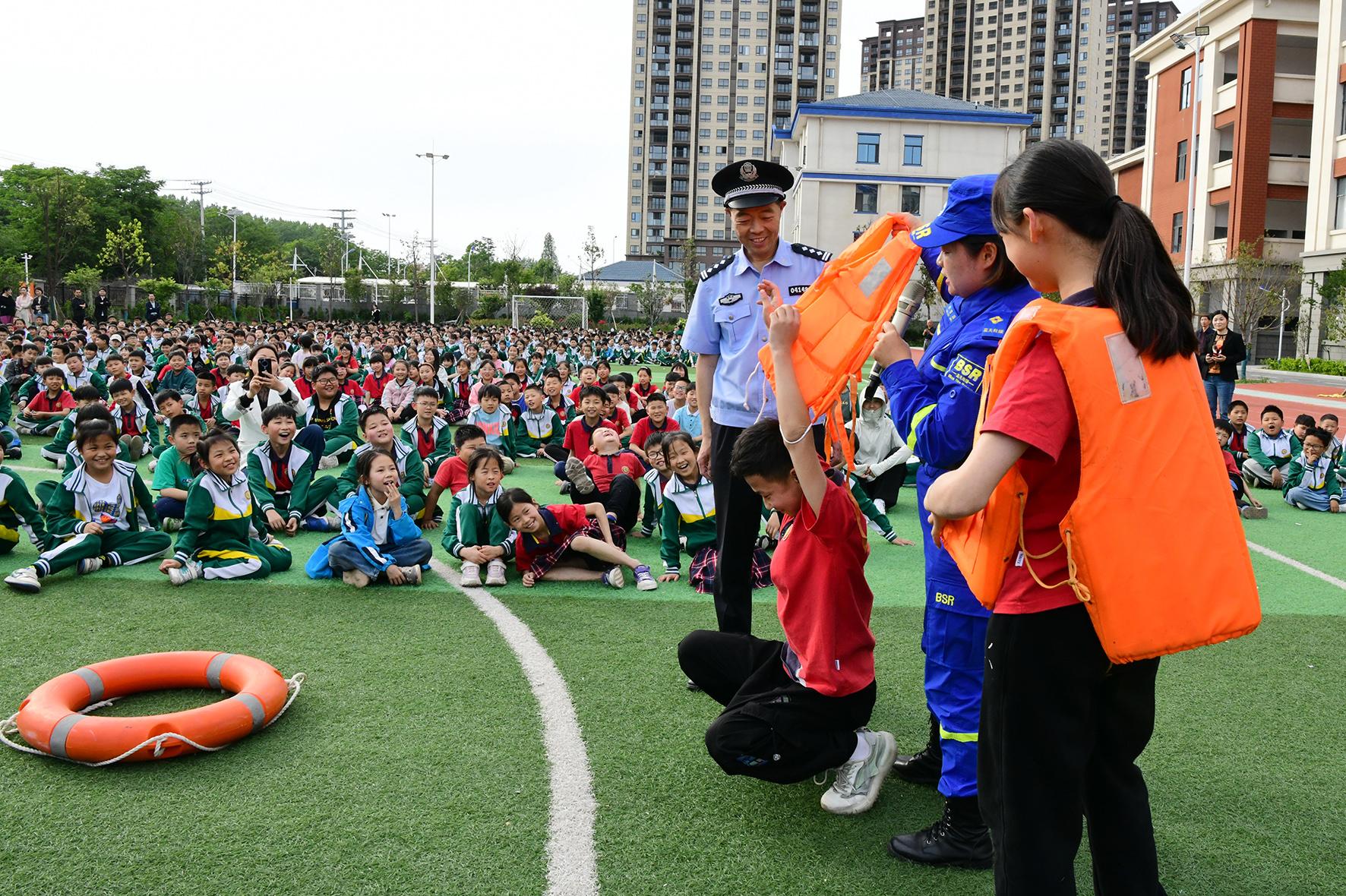 5月9日,安徽省阜陽(yáng)市阜南縣公安局城關(guān)派出所民警和藍(lán)天救援隊(duì)志愿者在第三小學(xué)為學(xué)生們演示防溺水措施。