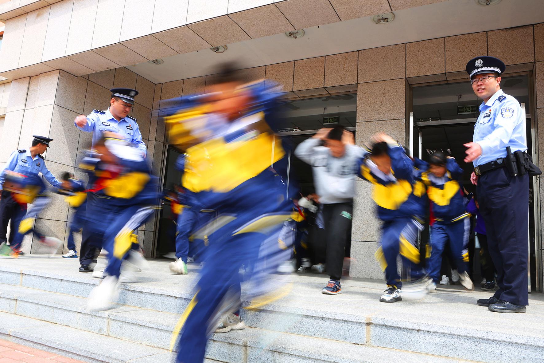 5月12日,陜西省渭南市公安局臨渭分局巡特警大隊開展全國防災減災日主題宣傳進校園活動,特警隊員組織學生有序“逃生”。
