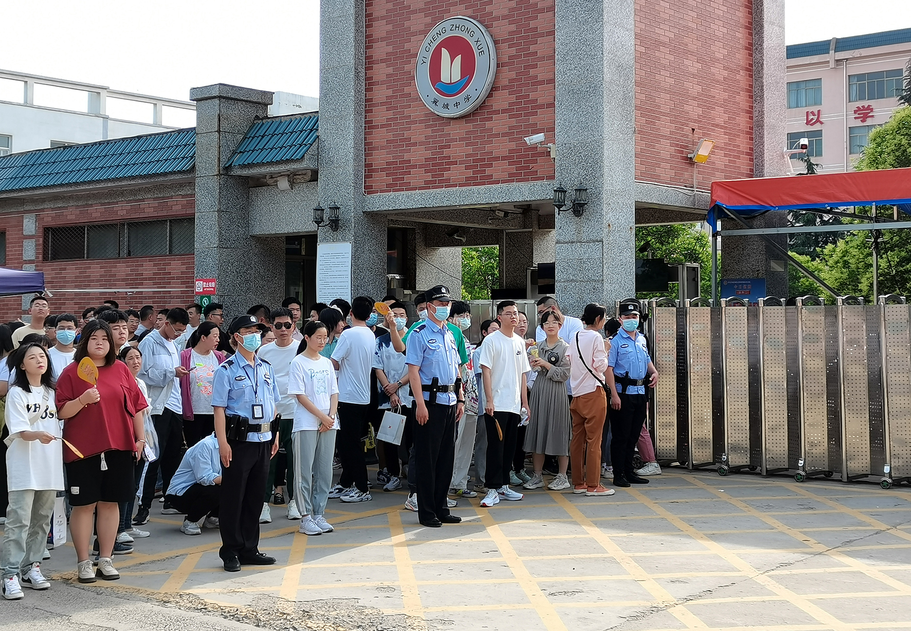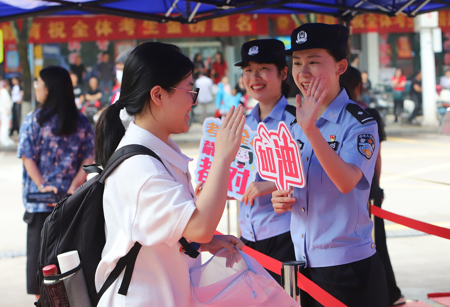6月7日,河南省鄭州市公安局金水分局巡特警隊員及轄區(qū)派出所民輔警在考場入口處護(hù)航高考服務(wù)考生和家長。