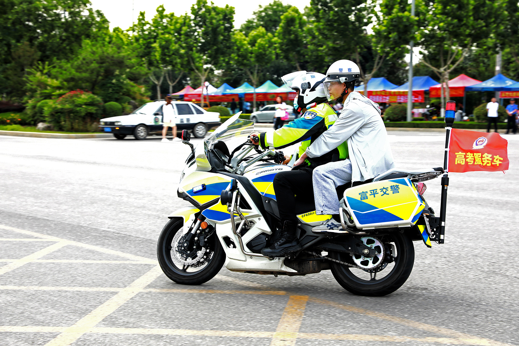 6月7日,陜西省富平縣公安局110接到報警求助后,交警鐵騎隊隊員僅用2分半鐘便將一名考生安全順利送達(dá)兩公里外的考點。