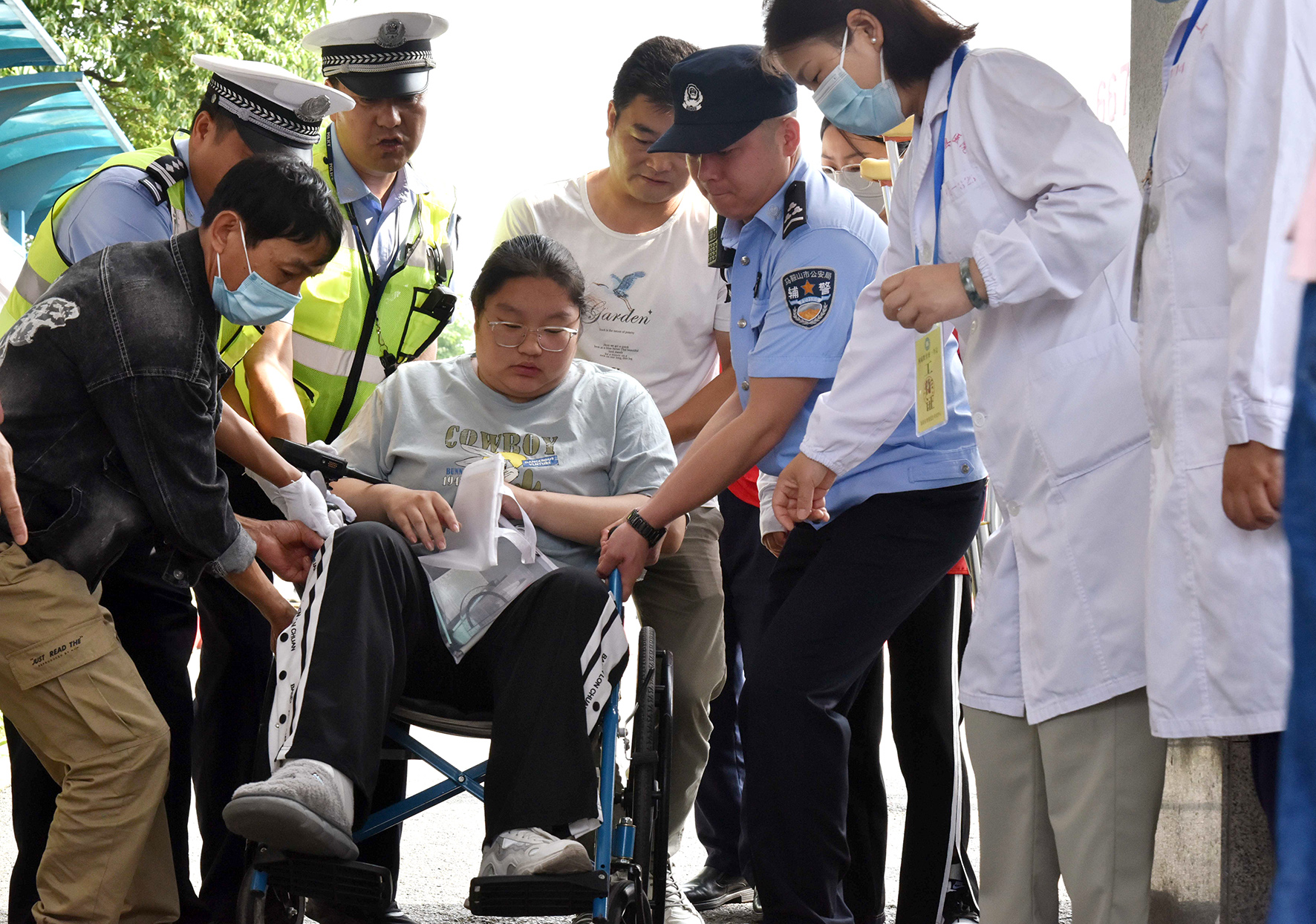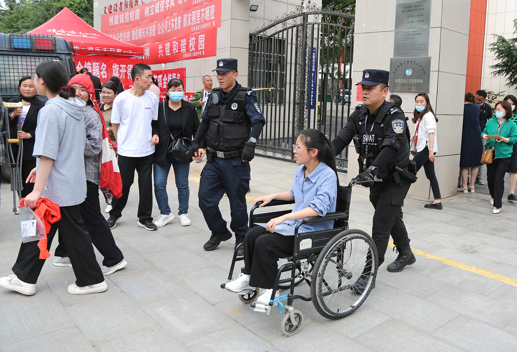 6月7日,安徽省當(dāng)涂縣公安局民警和志愿者幫助一名坐輪椅的考生進(jìn)入考場。