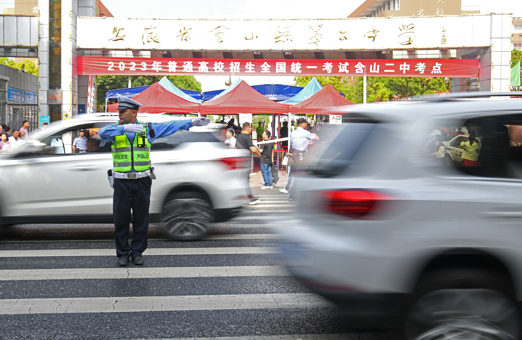 6月7日,安徽省含山縣公安局民輔警在轄區(qū)高考路段主要路口設(shè)崗,及時疏導(dǎo)交通擁堵,保障考點周邊道路交通秩序。