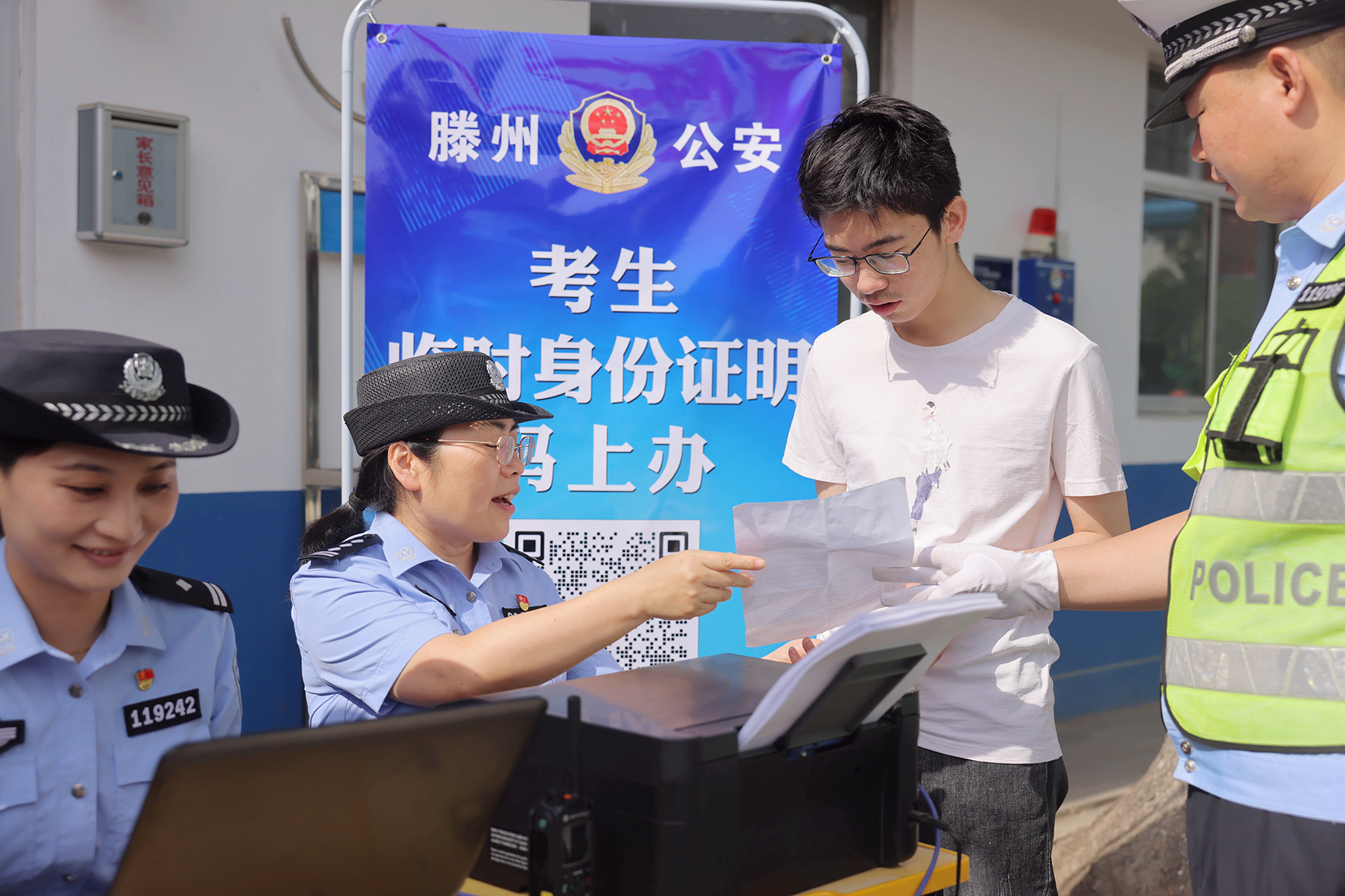 6月7日,山東省滕州市公安局民警為考試前居民身份證丟失、損壞的考生,開辟高考“綠色通道”,提供身份信息核實、出具臨時身份證明服務(wù)。