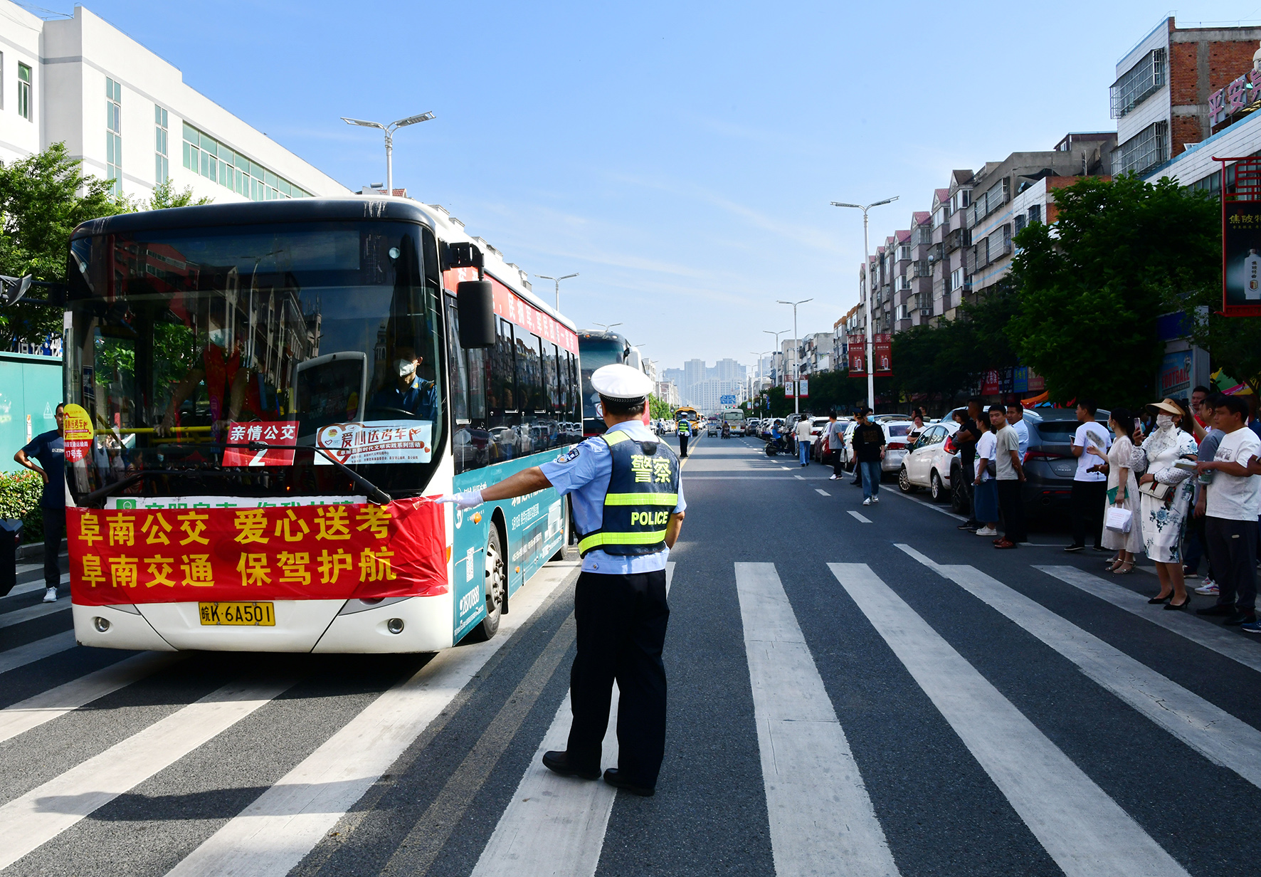 6月7日,安徽省阜南縣公安局組織交巡警、治安民警等警種在4個高考點周邊路段維持交通和治安秩序,同時還為考生做好應(yīng)急服務(wù)工作。
