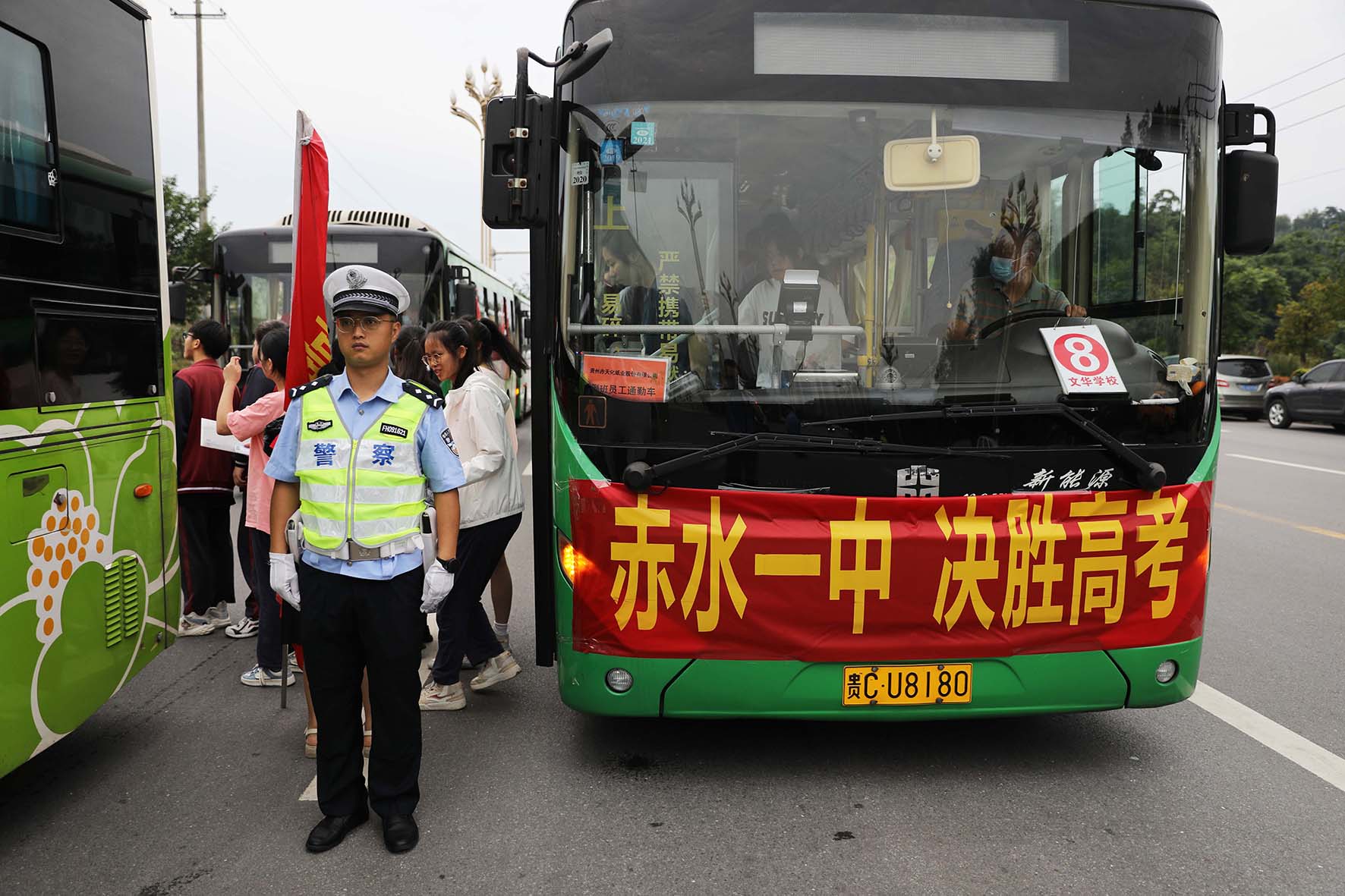 6月7日,貴州省赤水市公安局民警在第三中學(xué)考點現(xiàn)場維持秩序。