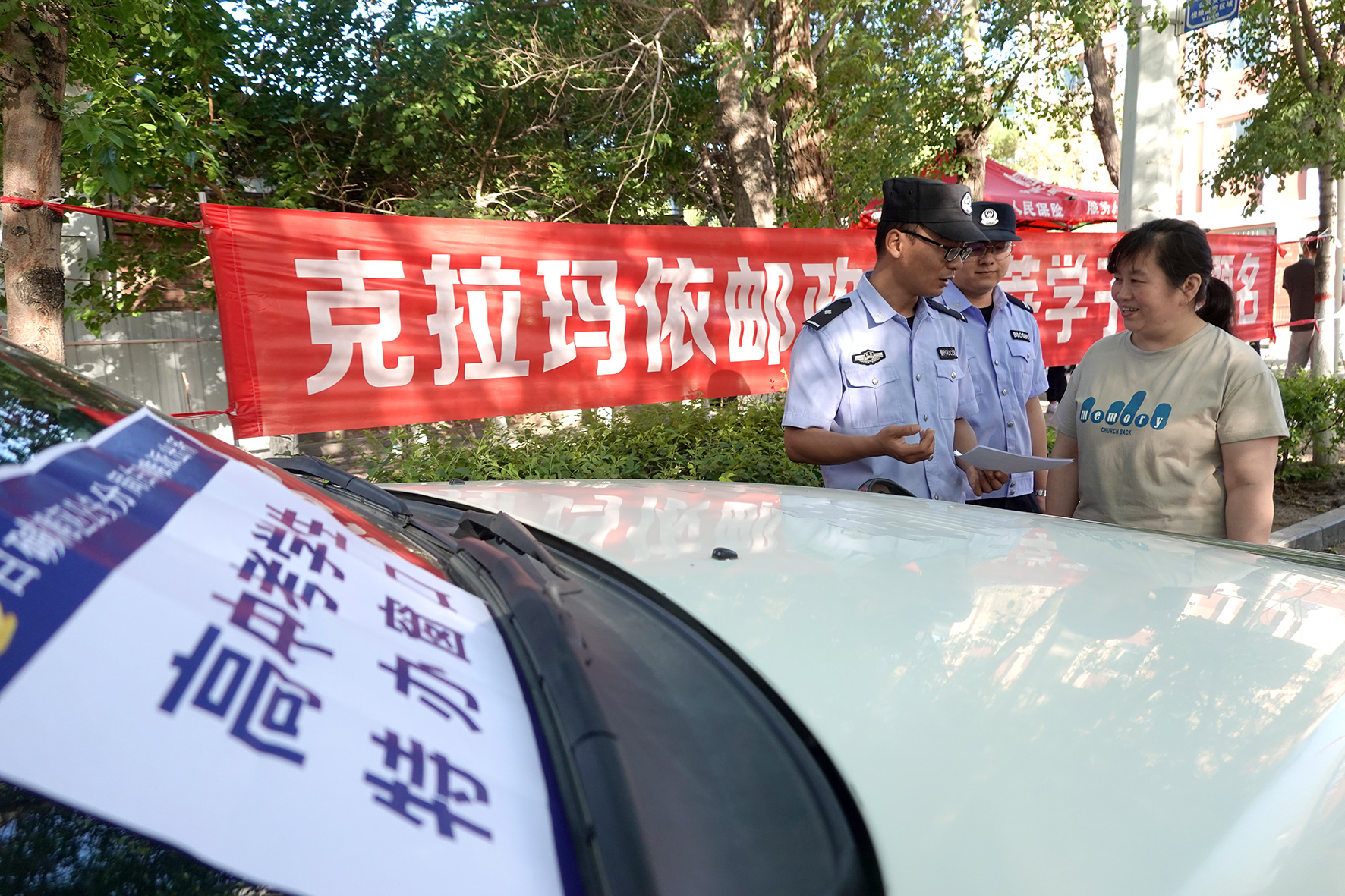 6月7日,新疆克拉瑪依市公安局白堿灘區(qū)分局民警給考生家長耐心解答特辦窗口業(yè)務(wù)流程。