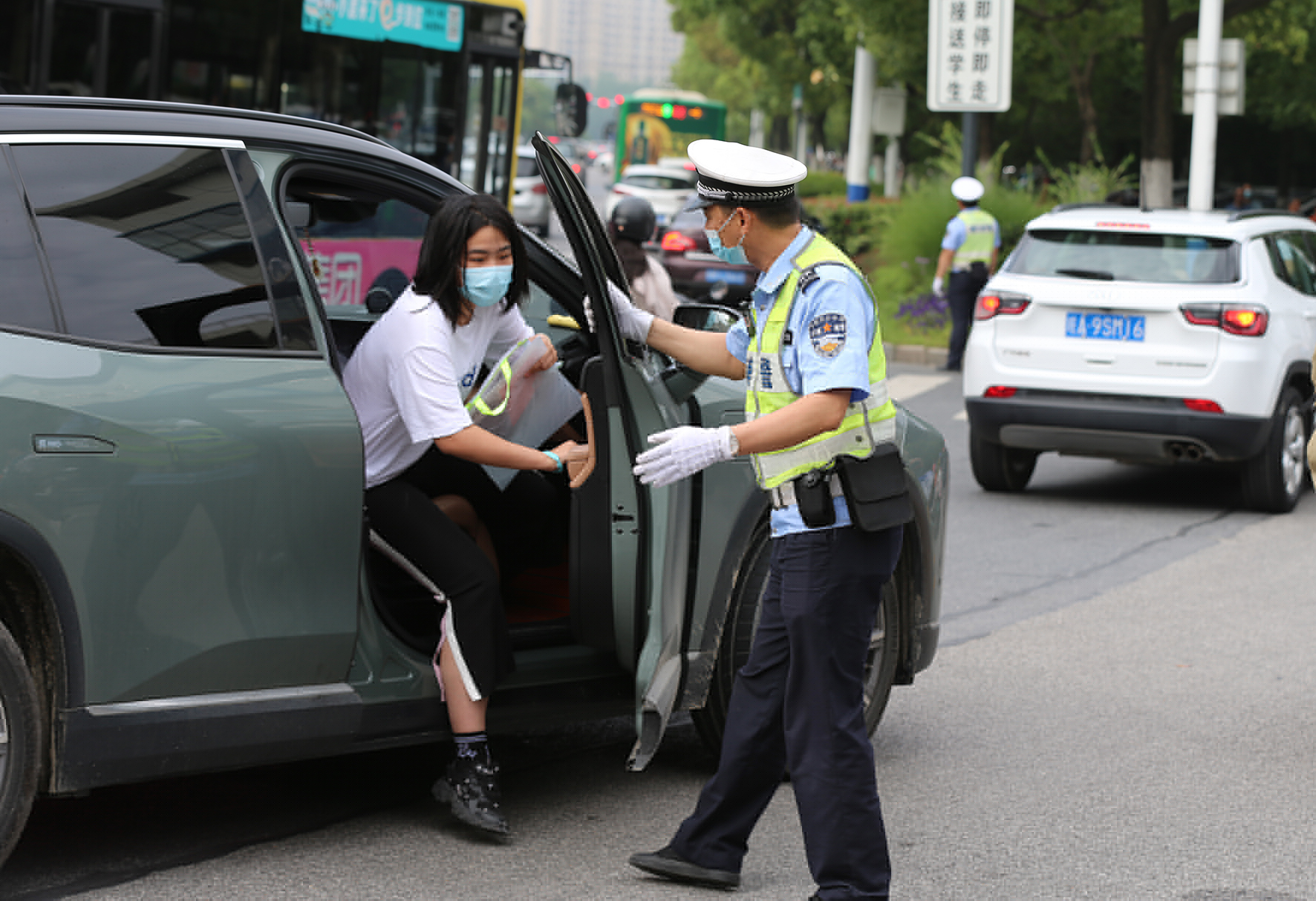 6月7日,安徽省合肥市公安局交警支隊民警在第八中學(xué)考點引導(dǎo)送考車輛,同時為考生及家長提供便民服務(wù)。