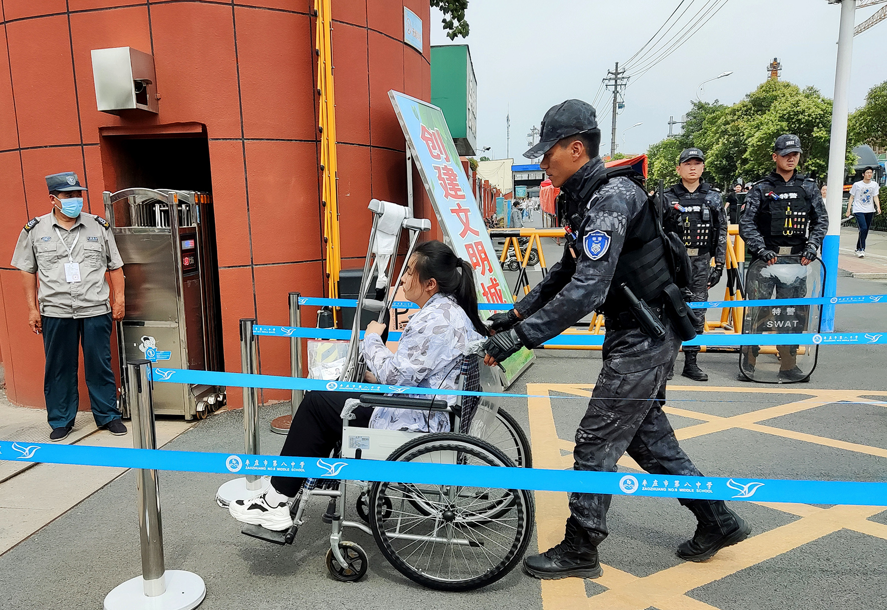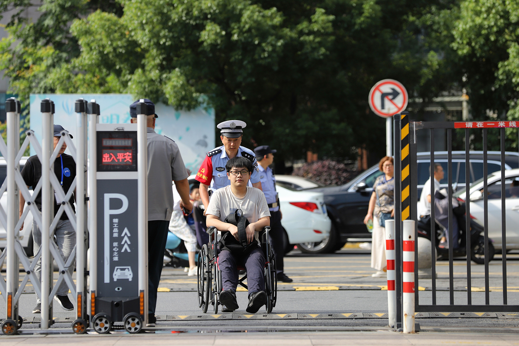 6月7日,山東省棗莊市公安局薛城分局民警在轄區(qū)棗莊第八中學(xué)考點幫助行動不便的考生進(jìn)入考場。
