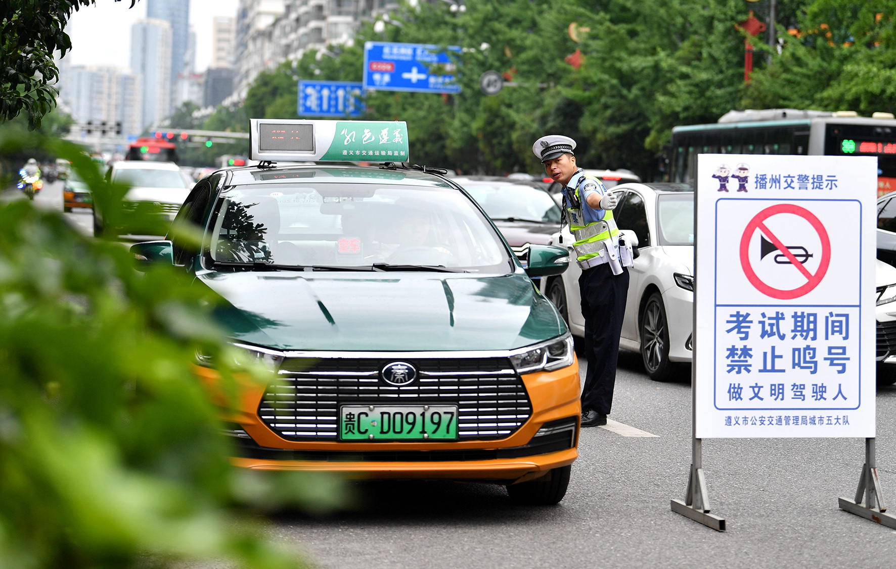 6月7日,貴州省遵義市公安局民警在各考點開展治安巡邏值守、交通秩序維護(hù)、為考生提供服務(wù),全力以赴保駕護(hù)航。