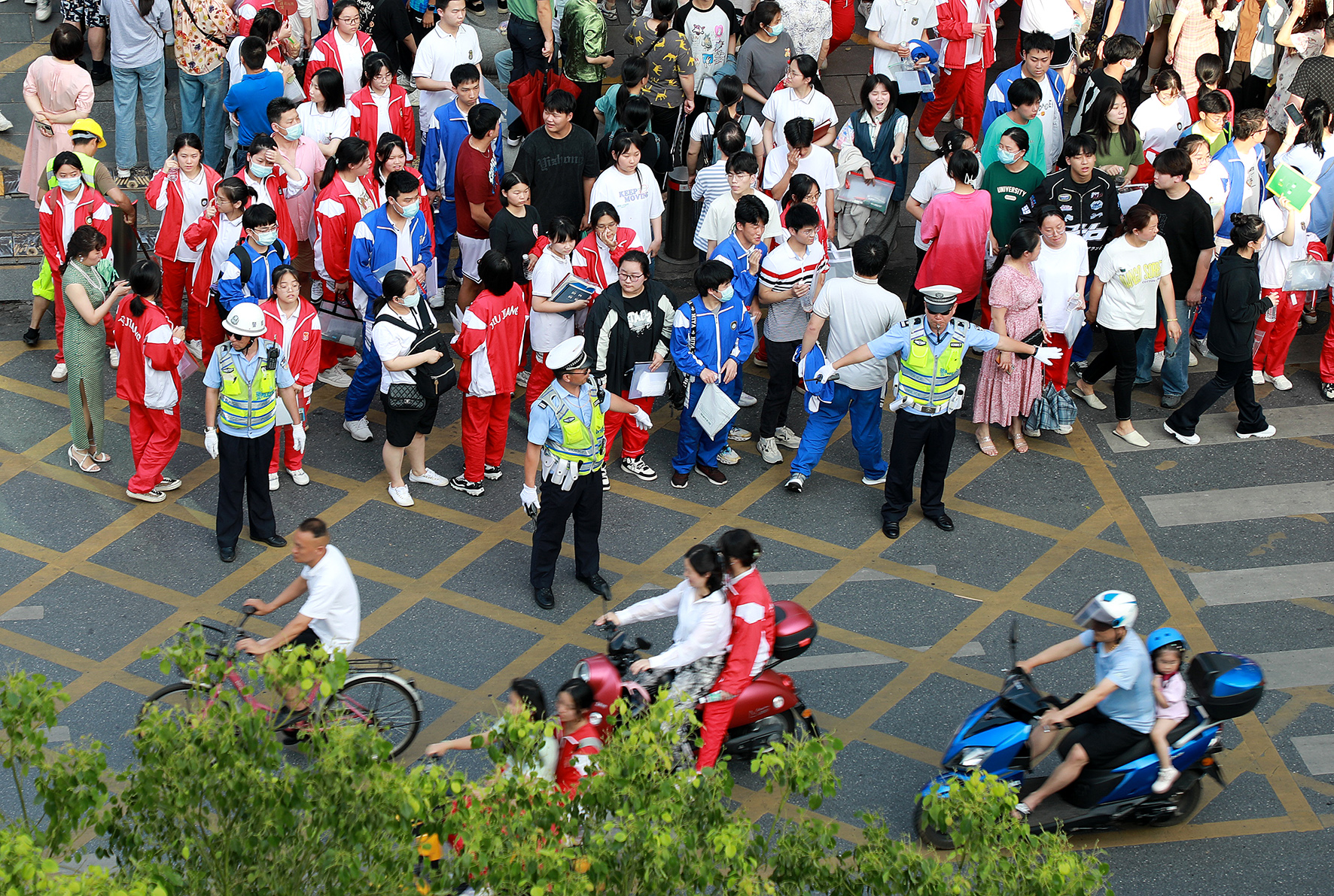 6月8日,安徽省巢湖市公安局交警大隊民輔警在維護(hù)高考考生散場后的路面交通秩序。