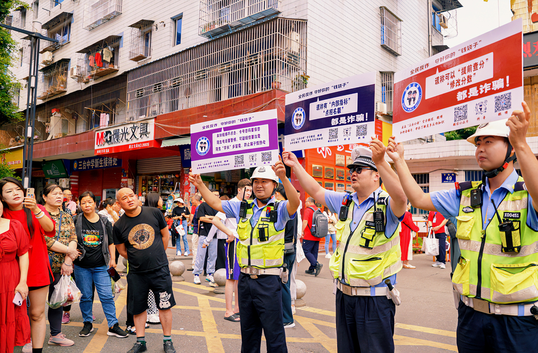 6月7日,四川省綿陽市公安局針對提前查分、修改分?jǐn)?shù)等詐騙行為,在多個考場外設(shè)置宣傳點,組織民警向等候的家長開展防詐宣傳。
