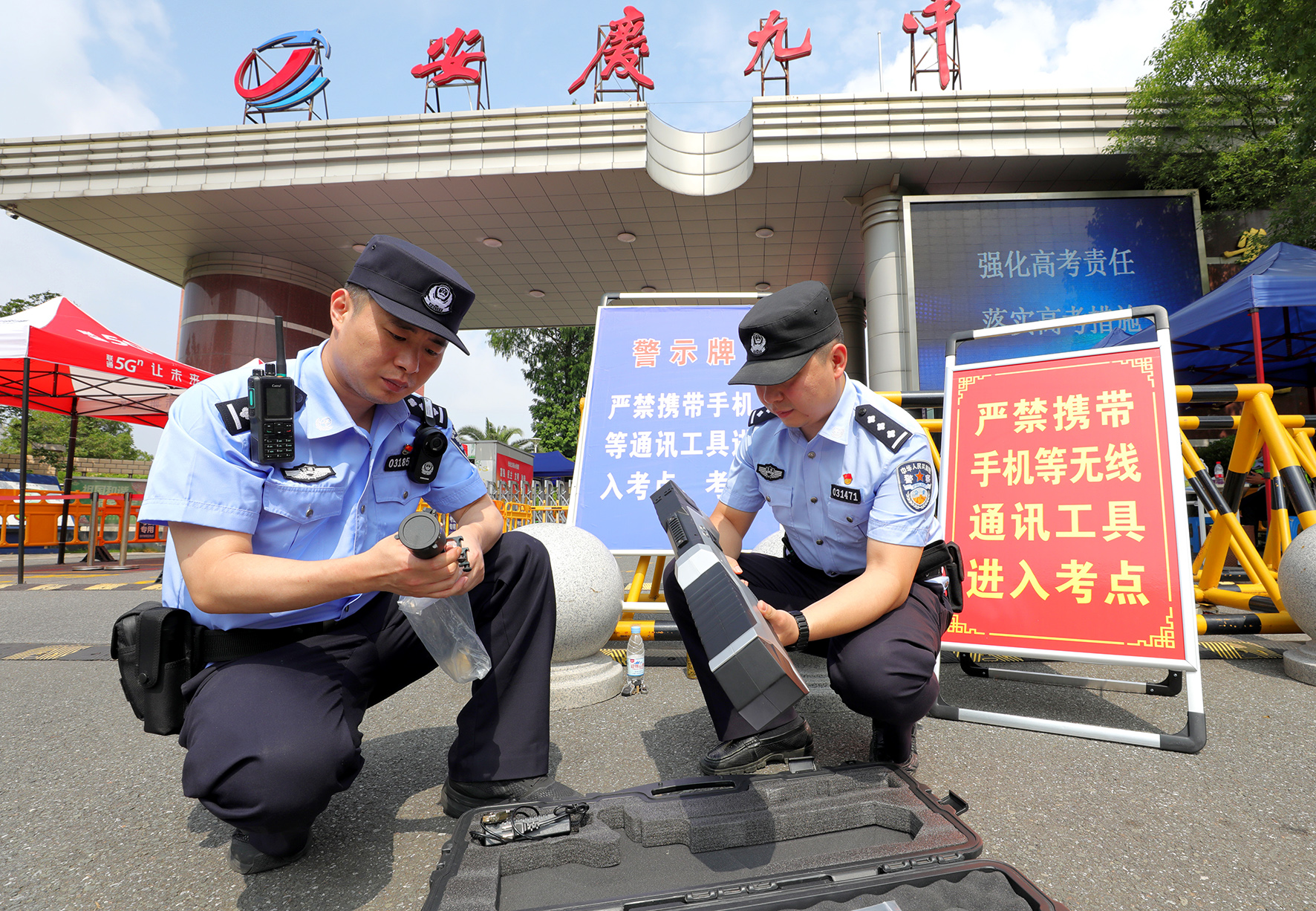6月7日,安徽省安慶市公安局經(jīng)開分局民警正在利用無人機反制設(shè)備對考點周邊進(jìn)行空中安全管控。