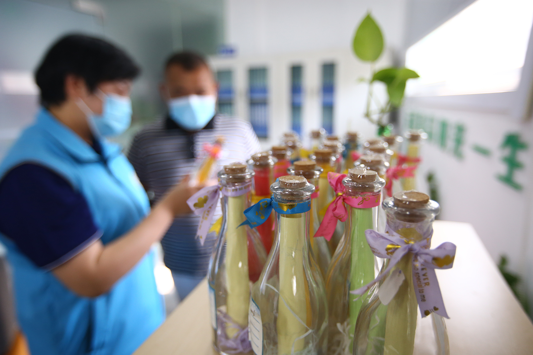 6月16日,山東省濟(jì)南市市中區(qū)桿石橋街道社區(qū)戒毒康復(fù)工作辦公室,禁毒社工高建華(左)正在給一位戒毒人員介紹陽(yáng)光心愿瓶的功能。據(jù)了解,社區(qū)戒毒人員來(lái)濟(jì)南市市中區(qū)桿石橋街道報(bào)到時(shí),禁毒社工會(huì)讓他們寫一個(gè)心愿紙條放到玻璃瓶里,等三年社區(qū)戒毒結(jié)束后取出紙條看一下自己的心愿是否實(shí)現(xiàn)。陽(yáng)光心愿瓶對(duì)戒毒人員有精神寄托作用,同時(shí)也是一種心理約束,時(shí)刻提醒著他們樹(shù)立正確的人生觀和價(jià)值觀,擺脫毒癮回歸正常生活。