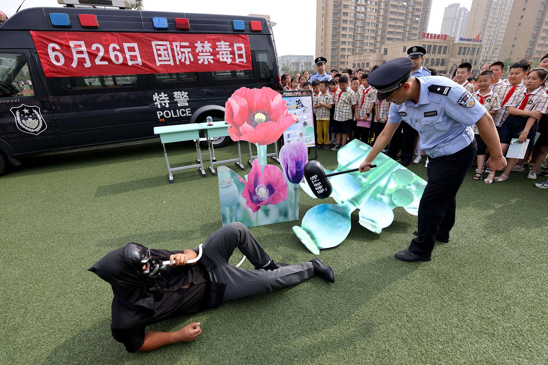 6月21日,山東省棗莊市公安局市中分局民警在東湖小學(xué)給學(xué)生們表演自編的情景劇“吸毒者下場”。在國際禁毒日來臨之際,棗莊市公安局市中分局圍繞“健康人生、綠色無毒”的宣傳主題,組織民警走進(jìn)校園開展禁毒宣傳教育活動,通過多種形式讓學(xué)生們了解毒品危害,從小培養(yǎng)他們的識毒、防毒、拒毒意識。