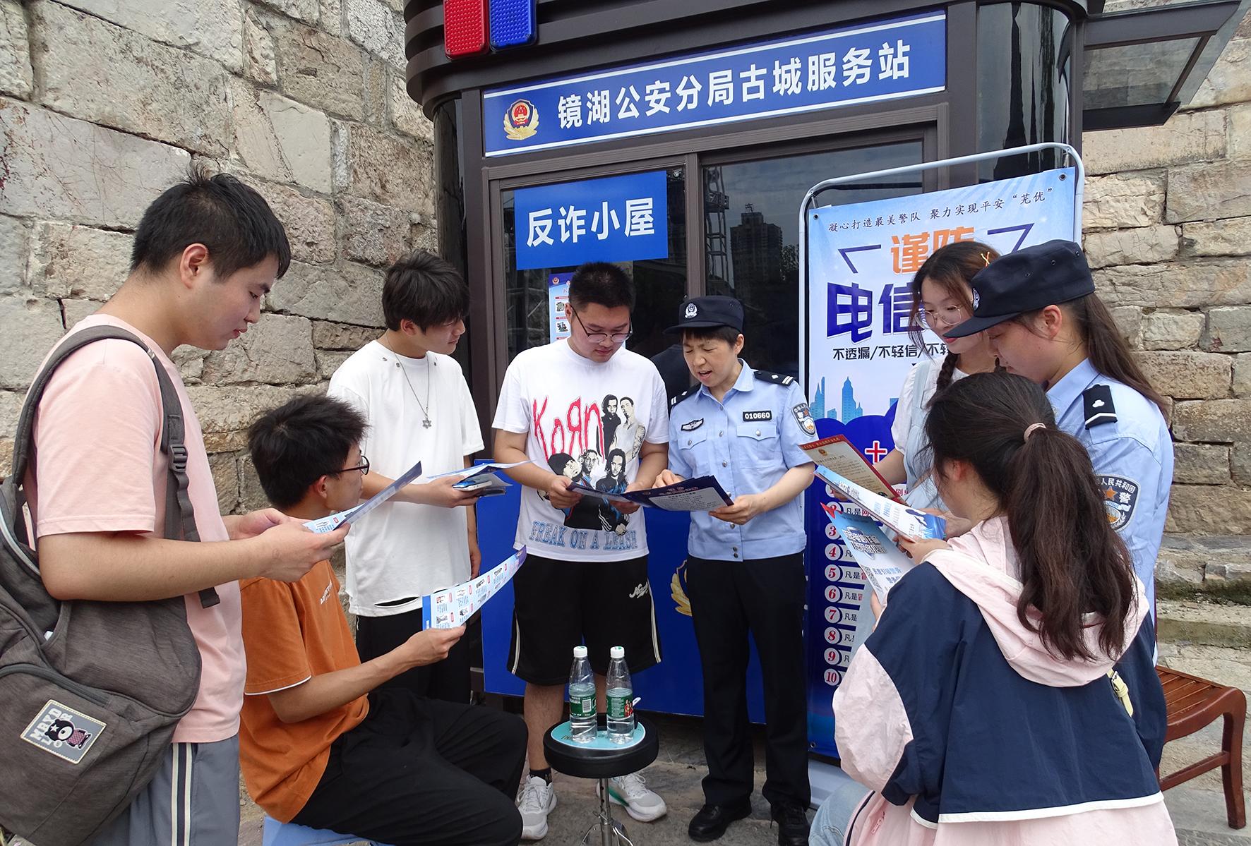 為進(jìn)一步提高群眾防范網(wǎng)絡(luò)電信詐騙意識(shí),延伸防范電詐觸角,7月6日,安徽省蕪湖市公安局鏡湖分局分局東門(mén)派出所創(chuàng)新反詐宣傳方式,在古城景區(qū)專門(mén)設(shè)置了一間“反詐小屋”,游客可以隨時(shí)領(lǐng)取宣傳單、掃反詐二維碼、觀看警示教育。