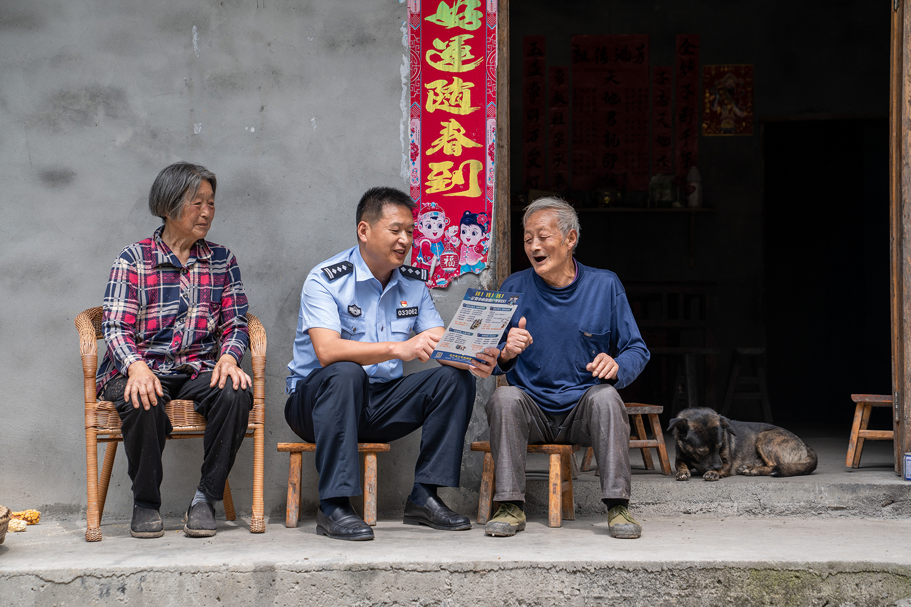 8月28日,四川省綿陽市北川羌族自治縣公安局民警在漩坪鄉(xiāng)清潔村向老年群體宣傳防范養(yǎng)老詐騙知識。