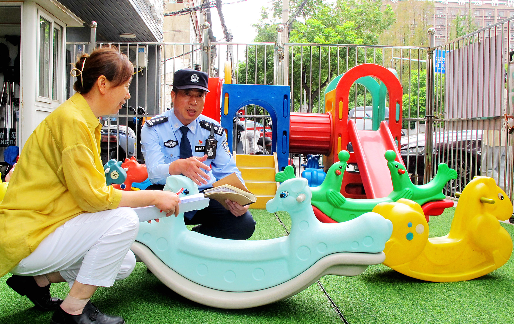 8月28日,湖北省武漢市公安局東西湖區(qū)分局長青街派出所華星社區(qū)警務(wù)室民警對轄區(qū)幼兒園及學(xué)校設(shè)施進(jìn)行安全隱患排查和清理。