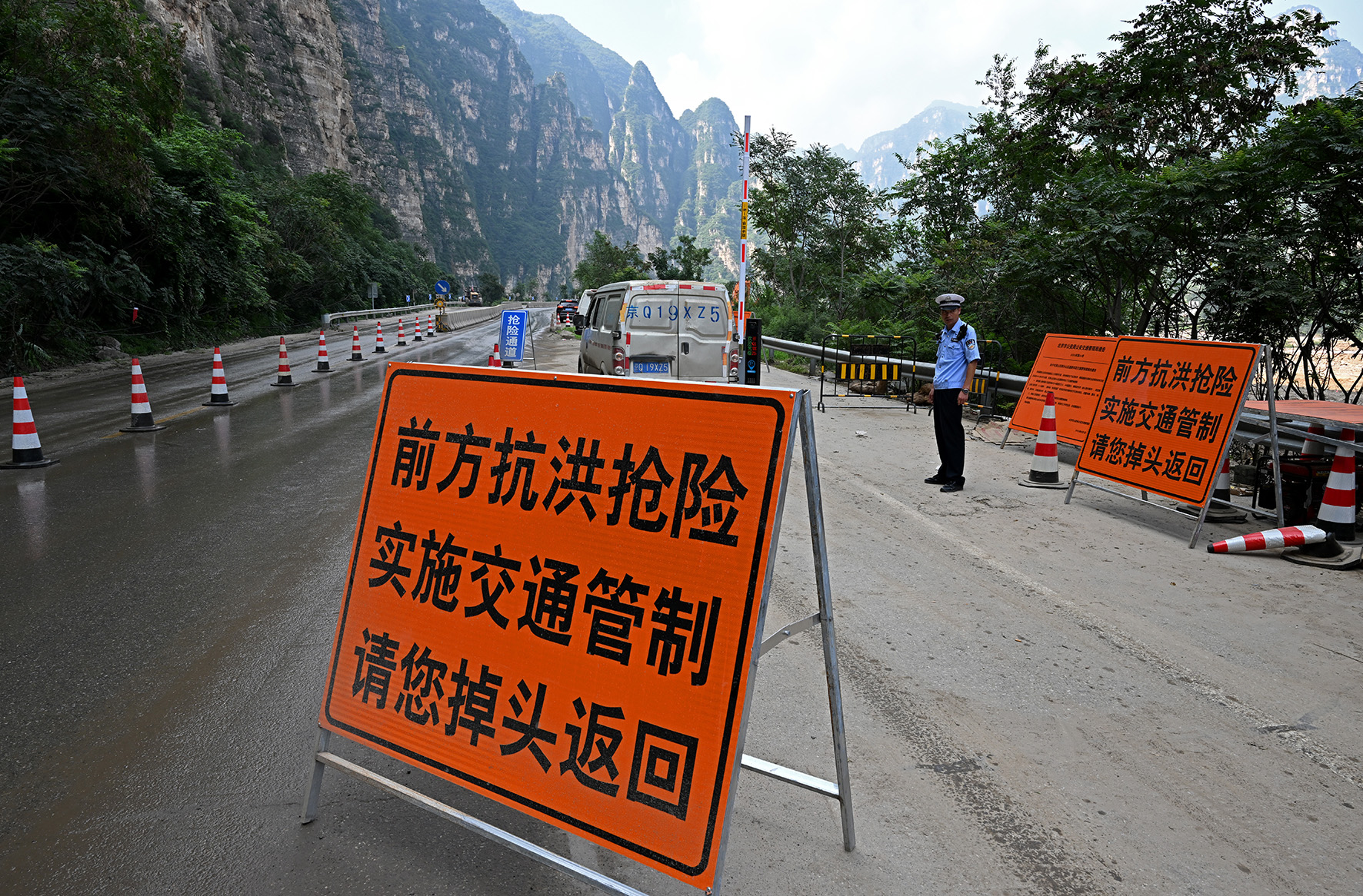7月29日至8月2日,北京遭遇特大暴雨災(zāi)害,房山區(qū)成為人員財(cái)產(chǎn)損失最嚴(yán)重的地區(qū)之一。張坊檢查崗是進(jìn)入受災(zāi)嚴(yán)重地區(qū)的第一道崗,在被損毀的道路尚未恢復(fù)通行能力前,只有救援相關(guān)車輛和當(dāng)?shù)卮迕癖辉试S進(jìn)入?!爱?dāng)前首要任務(wù)是保證救援保障力量的順暢進(jìn)出?!比f寧大隊(duì)民警宗曉磊告訴記者,從7月28日汛前備勤起,他和同事們就堅(jiān)守在這條進(jìn)山通道,迄今已20多天。