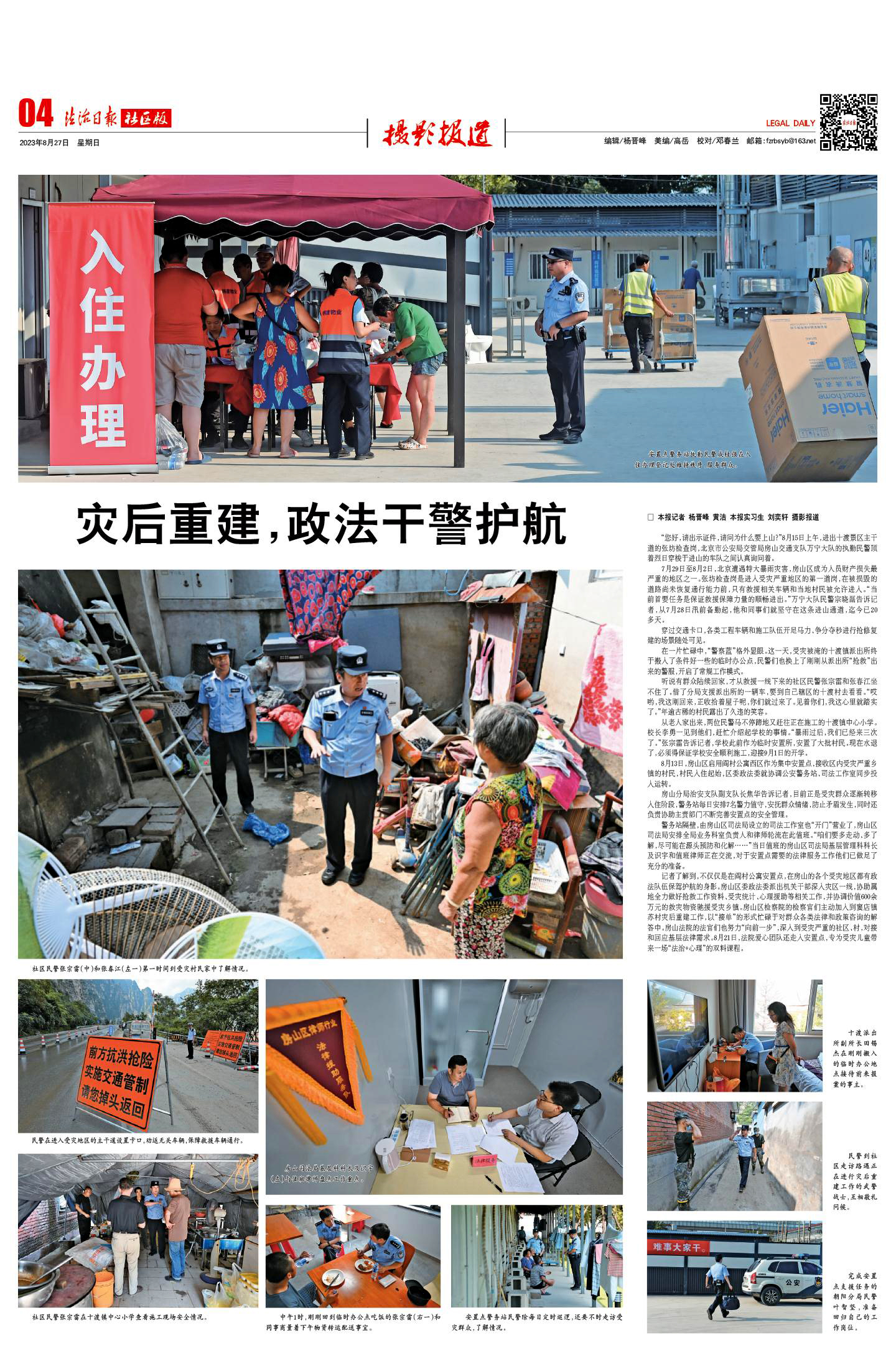 記者了解到,不僅僅是在閻村公寓安置點(diǎn),在房山的各個(gè)受災(zāi)地區(qū)都有政法隊(duì)伍保駕護(hù)航的身影。房山區(qū)委政法委派出機(jī)關(guān)干部深入災(zāi)區(qū)一線,協(xié)助屬地全力做好搶救工作資料、受災(zāi)統(tǒng)計(jì)、心理援助等相關(guān)工作,并協(xié)調(diào)價(jià)值600余萬元的救災(zāi)物資馳援受災(zāi)鄉(xiāng)鎮(zhèn)。房山區(qū)檢察院的檢察官們主動(dòng)加入到竇店鎮(zhèn)蘇村災(zāi)后重建工作,以“接單”的形式忙碌于對群眾各類法律和政策咨詢的解答中。房山法院的法官們也努力“向前一步”,深入到受災(zāi)嚴(yán)重的社區(qū)、村,對接和回應(yīng)基層法律需求。8月21日,法院愛心團(tuán)隊(duì)還走入安置點(diǎn),專為受災(zāi)兒童帶來一場“法治+心理”的雙料課程。