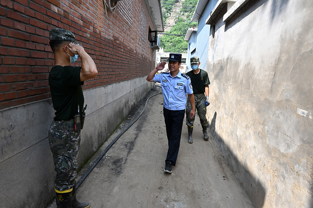 在一片忙碌中,“警察藍(lán)”格外顯眼。這一天,受災(zāi)被淹的十渡鎮(zhèn)派出所終于搬入了條件好一些的臨時(shí)辦公點(diǎn),民警們也換上了剛剛從派出所“搶救”出來的警服,開啟了常規(guī)工作模式。