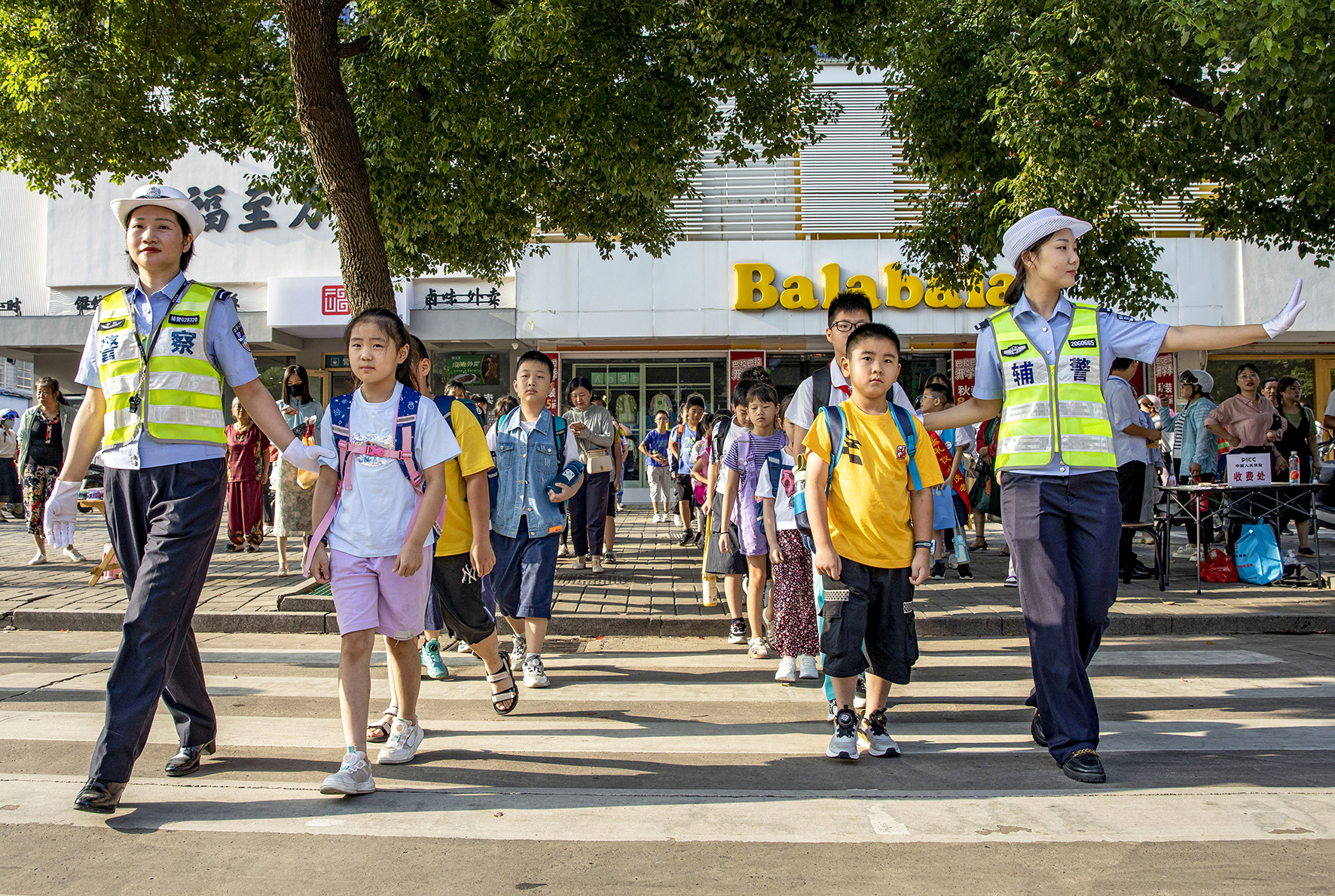 9月1日,安徽省蕪湖市公安局交警支隊(duì)弋江大隊(duì)女子護(hù)學(xué)崗民警輔警,在安徽師范大學(xué)附屬小學(xué)路段指揮疏導(dǎo)交通,守護(hù)學(xué)生平安。