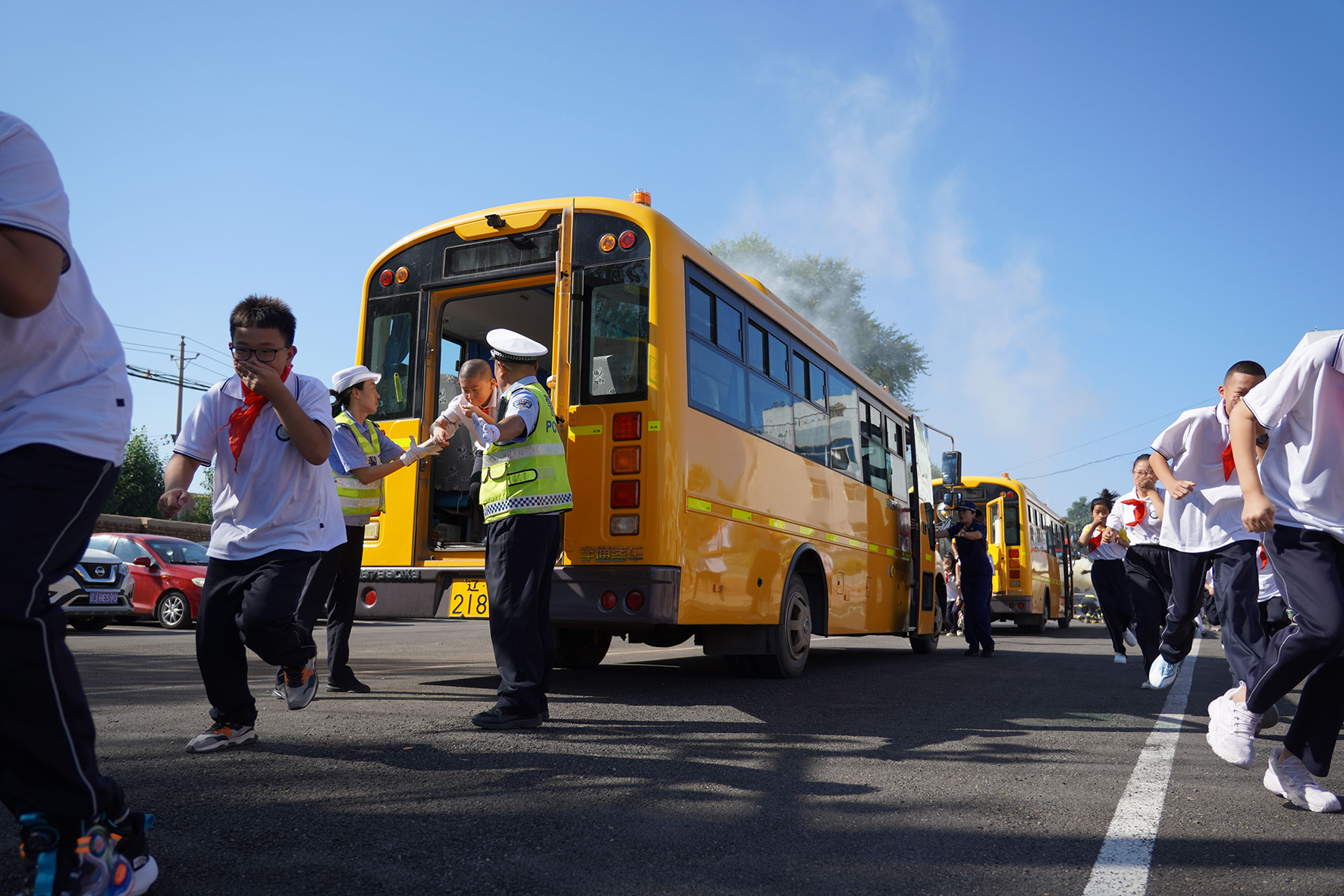 9月1日,開(kāi)學(xué)第一天。遼寧省阜新市公安局交警支隊(duì)太平大隊(duì)聯(lián)合太平區(qū)消防大隊(duì)走進(jìn)阜新市城南小學(xué)開(kāi)展“知危險(xiǎn) 會(huì)避險(xiǎn)”校車(chē)自燃事故應(yīng)急演練活動(dòng)。