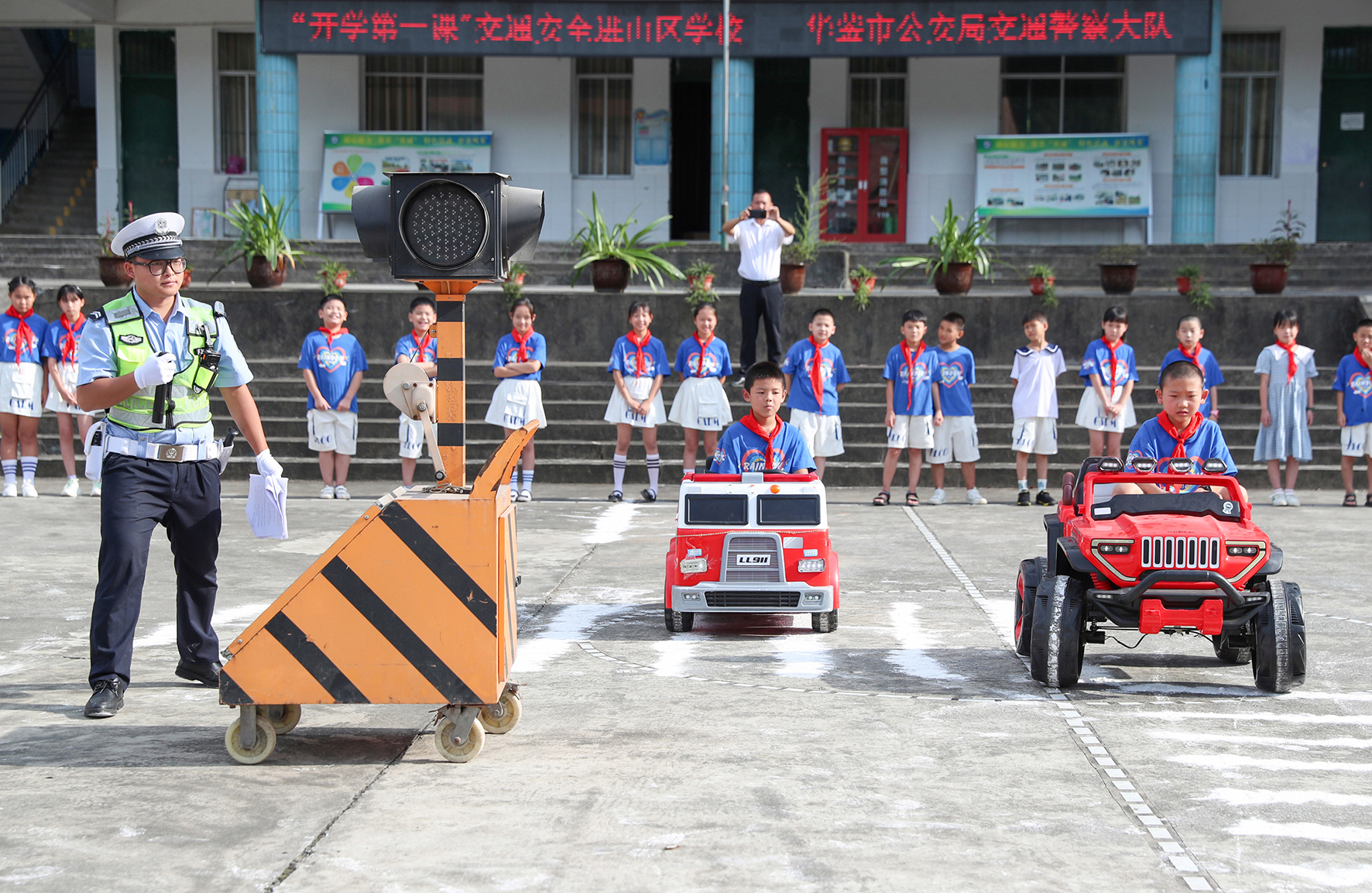 9月1日, 四川省華鎣市公安局交通警察大隊(duì)組織民警, 攜帶紅綠燈具、模型車(chē)、交通安全標(biāo)識(shí)牌等來(lái)到天池鎮(zhèn)小學(xué),開(kāi)展體驗(yàn)式交通安全教育。