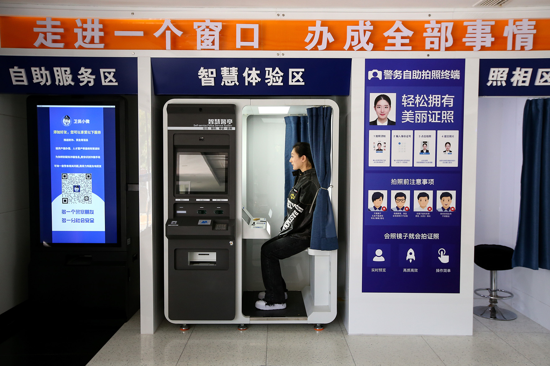 圖為10月25日,群眾在四里村派出所“一窗通辦”服務(wù)大廳,通過自助設(shè)備拍照采集個人信息,辦理相關(guān)業(yè)務(wù)。