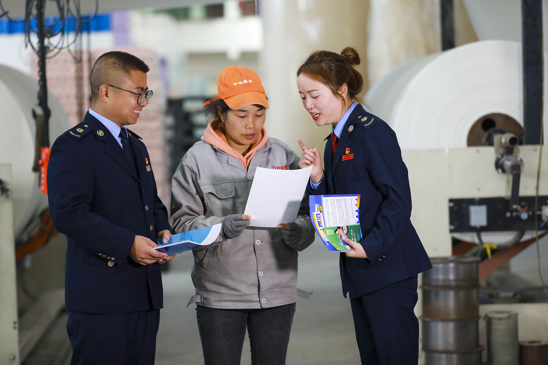 圖為11月24日,在貴州省黔西市鐘山鎮(zhèn)一家造紙企業(yè)生產(chǎn)車間,稅務(wù)部門工作人員實(shí)地走訪企業(yè),為企業(yè)員工講解稅惠政策和法規(guī)。