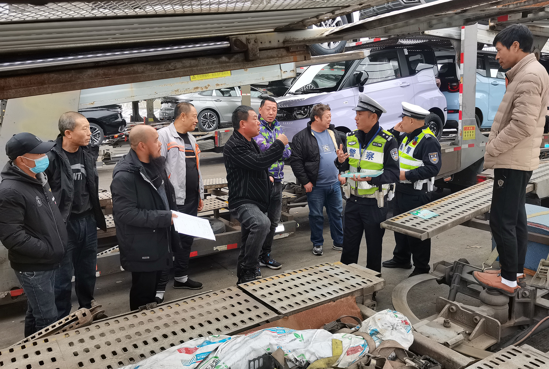 圖為12月14日,民輔警對一集裝箱運輸公司外地駕駛員宣傳冬季交通安全知識。