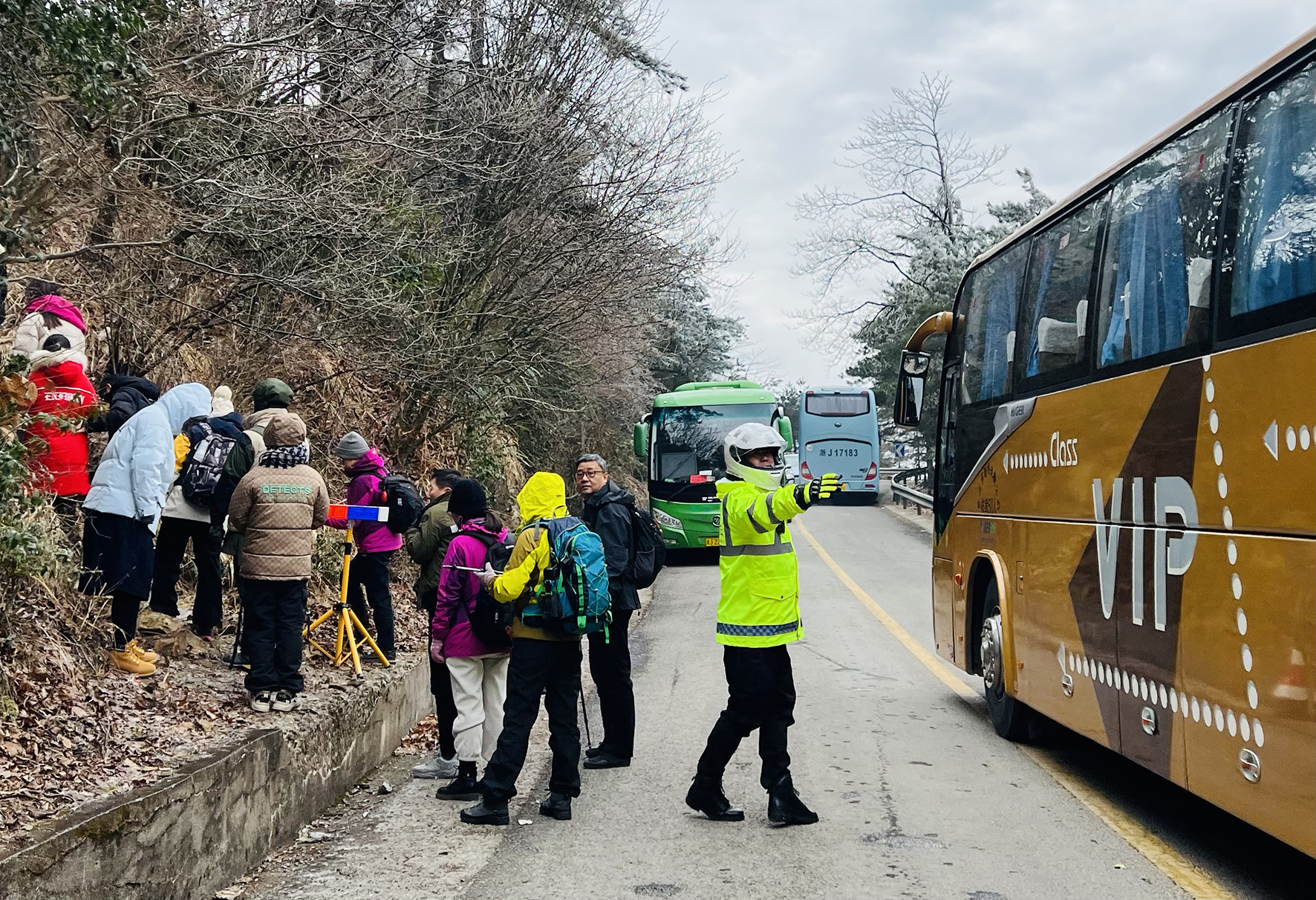 近日,受寒潮影響,浙江省臺(tái)州市天臺(tái)縣石梁鎮(zhèn)千米海拔的華頂山上迎來首場霧凇美景,吸引了大量不畏嚴(yán)寒前來觀賞的游客。天臺(tái)縣公安局交警大隊(duì)民輔警堅(jiān)守崗位,加強(qiáng)路面指揮疏導(dǎo),確保景區(qū)道路安全暢通,全力守護(hù)游客出行安全。