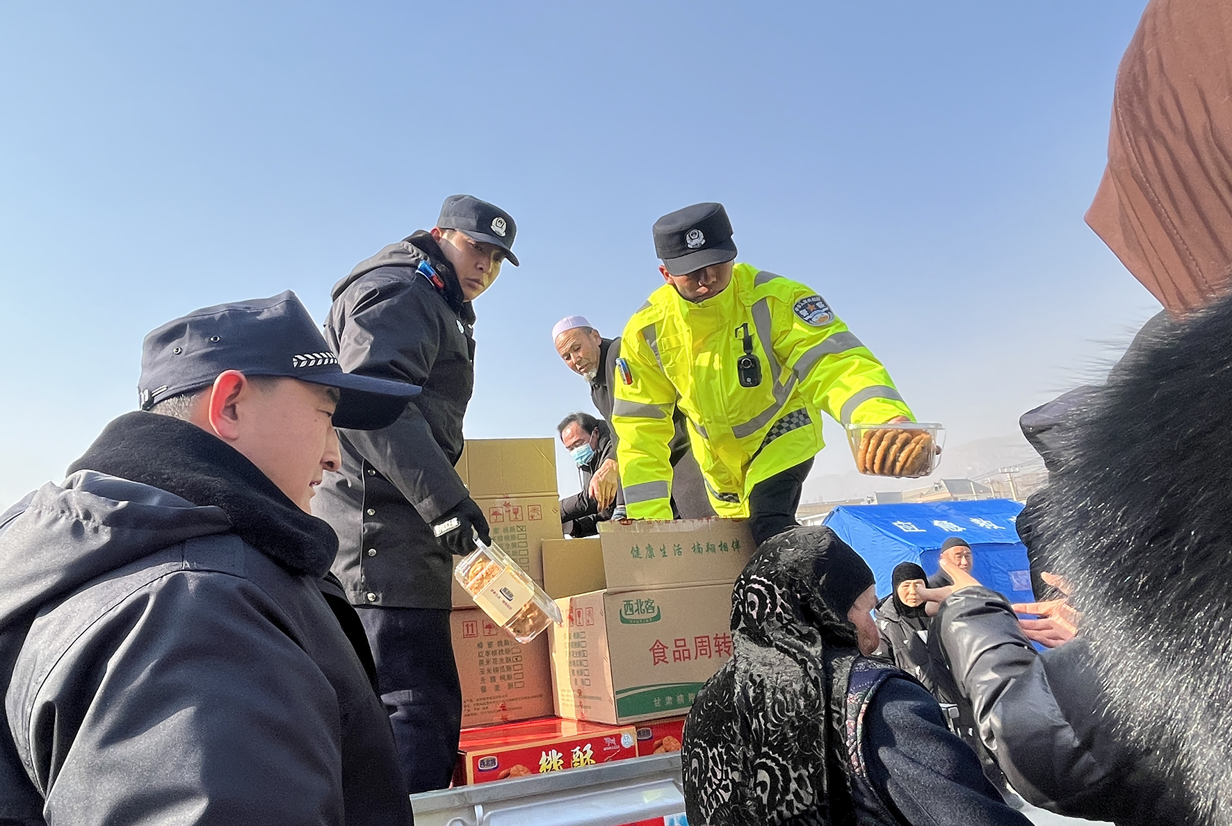 12月20日,甘肅省永靖縣公安局民輔警在積石山縣大河家臨時安置點(diǎn),按照抗震救災(zāi)指令要求,開展社會面管控、秩序維護(hù)、分發(fā)物資、搭建帳篷等工作,全力投入抗震救災(zāi)第一線。