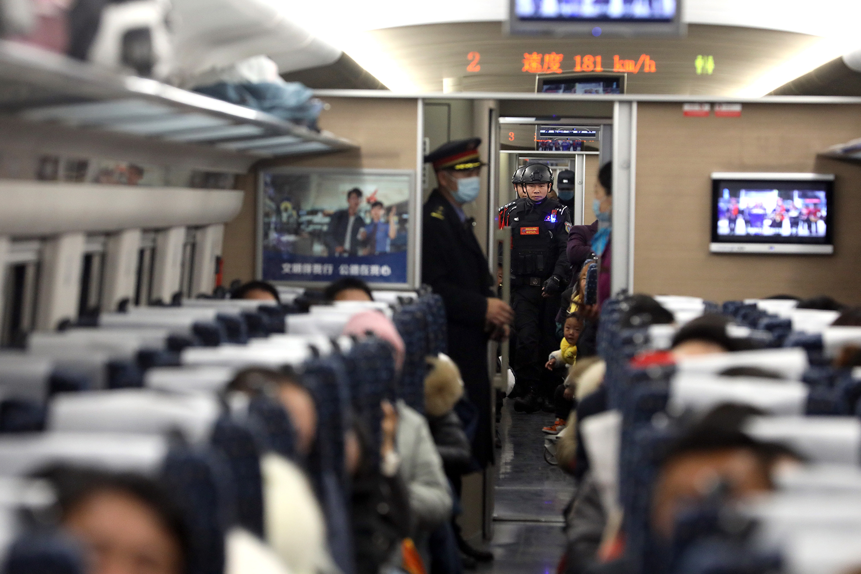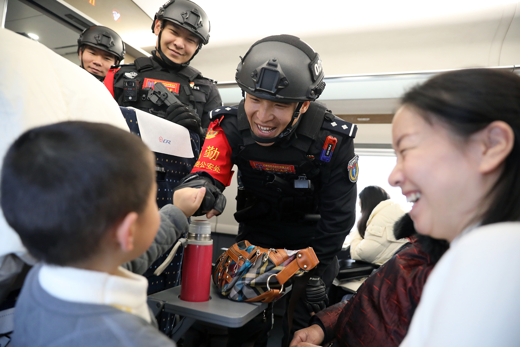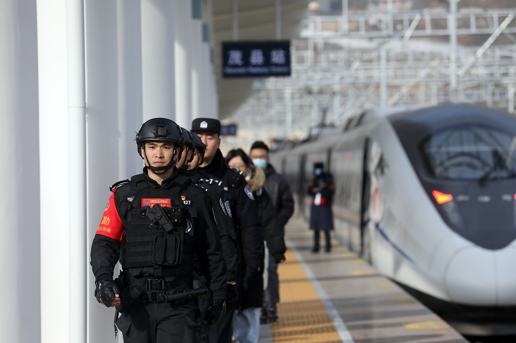 12月29日,在成都東開往茂縣的C6006次動車組列車上,一隊警容嚴(yán)整、精神飽滿的特警隊員格外引人注目,他們是成都鐵路公安處特警支隊民警,為旅客安全出行護航。