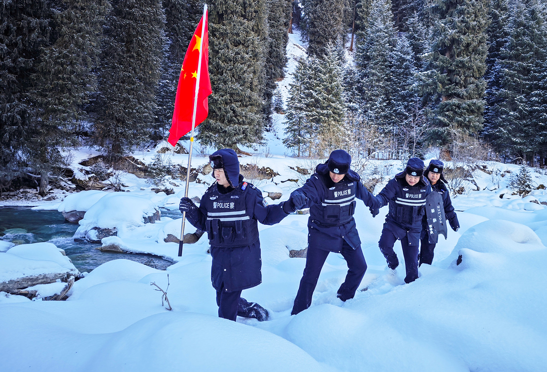 2023年12月29日,新疆出入境邊防檢查總站阿勒泰邊境管理支隊(duì)富蘊(yùn)邊境管理大隊(duì)庫(kù)衛(wèi)邊境派出所的民輔警對(duì)邊境重點(diǎn)區(qū)域進(jìn)行踏查。