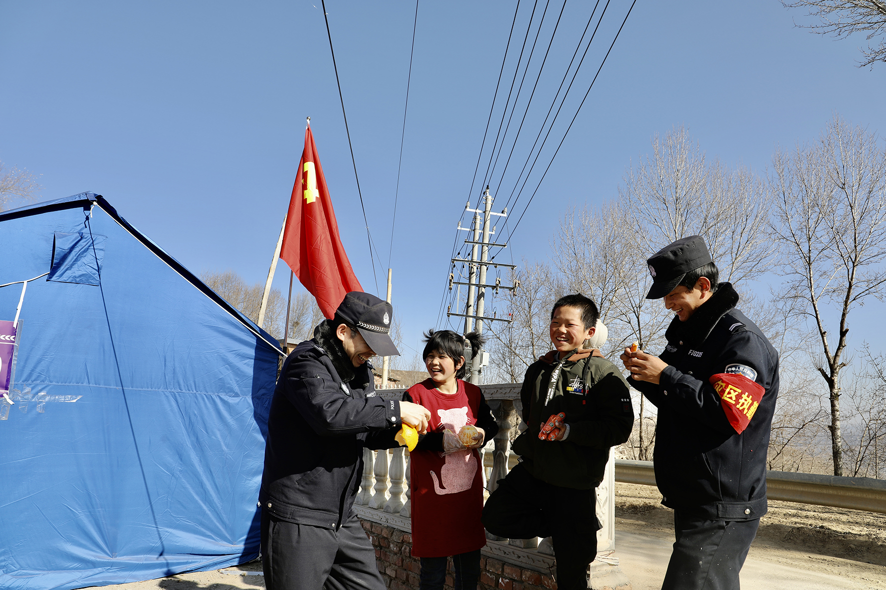 1月1日,甘肅省東鄉(xiāng)縣公安局民輔警在積石山縣柳溝鄉(xiāng)袁家村執(zhí)勤期間,幾名小朋友為民輔警送上自己制作的手工、圖畫(huà)和親筆信,用自己獨(dú)特的方式向抗震前線110的民輔警送上新年的第一份禮物。