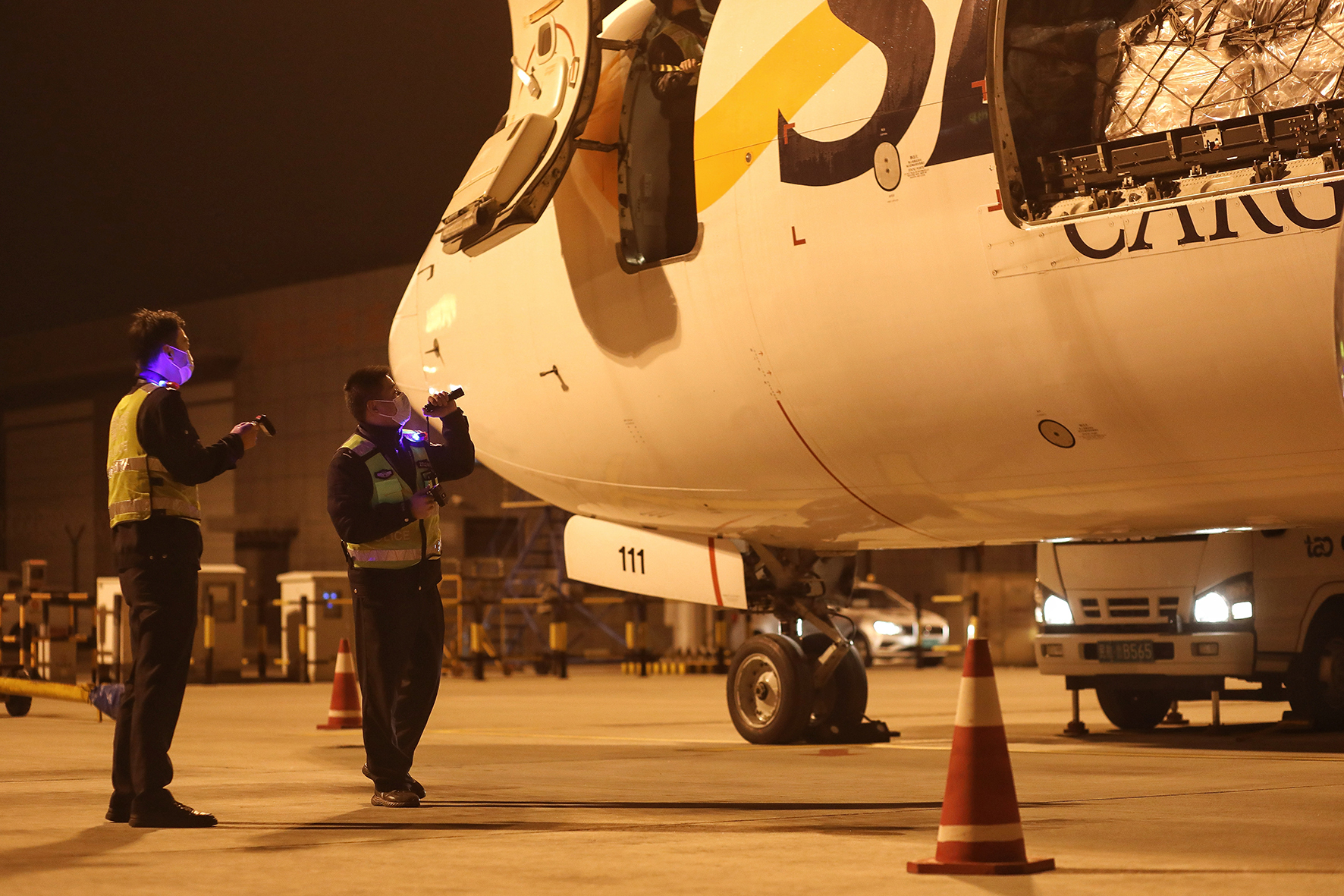 1月1日,山東出入境邊防檢查總站青島機(jī)場(chǎng)邊檢站民警對(duì)新年的首架?chē)?guó)際貨運(yùn)航班進(jìn)行清艙檢查。