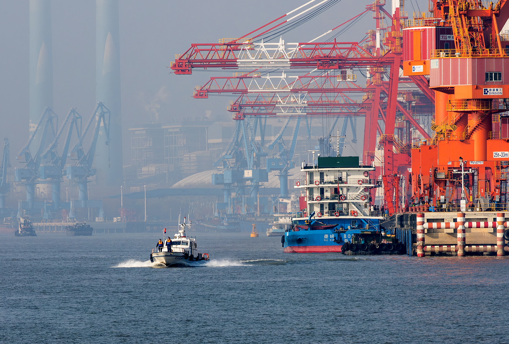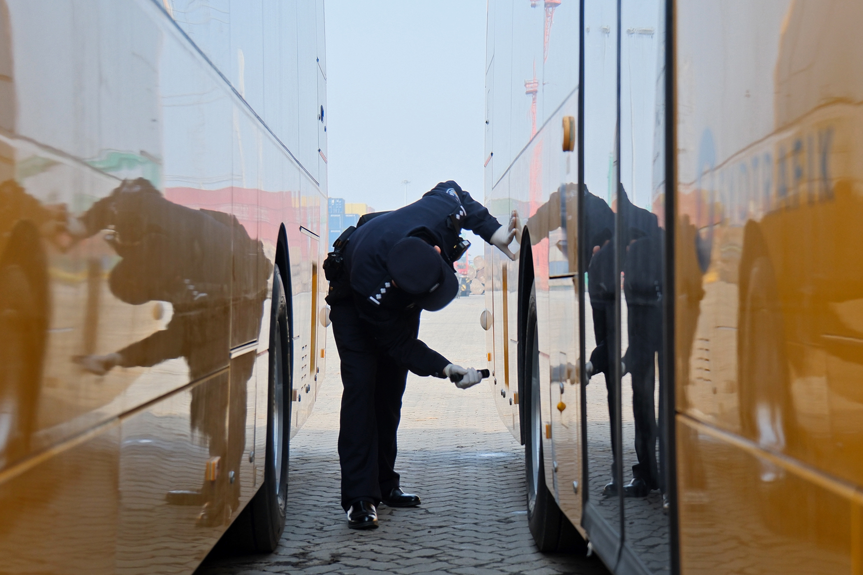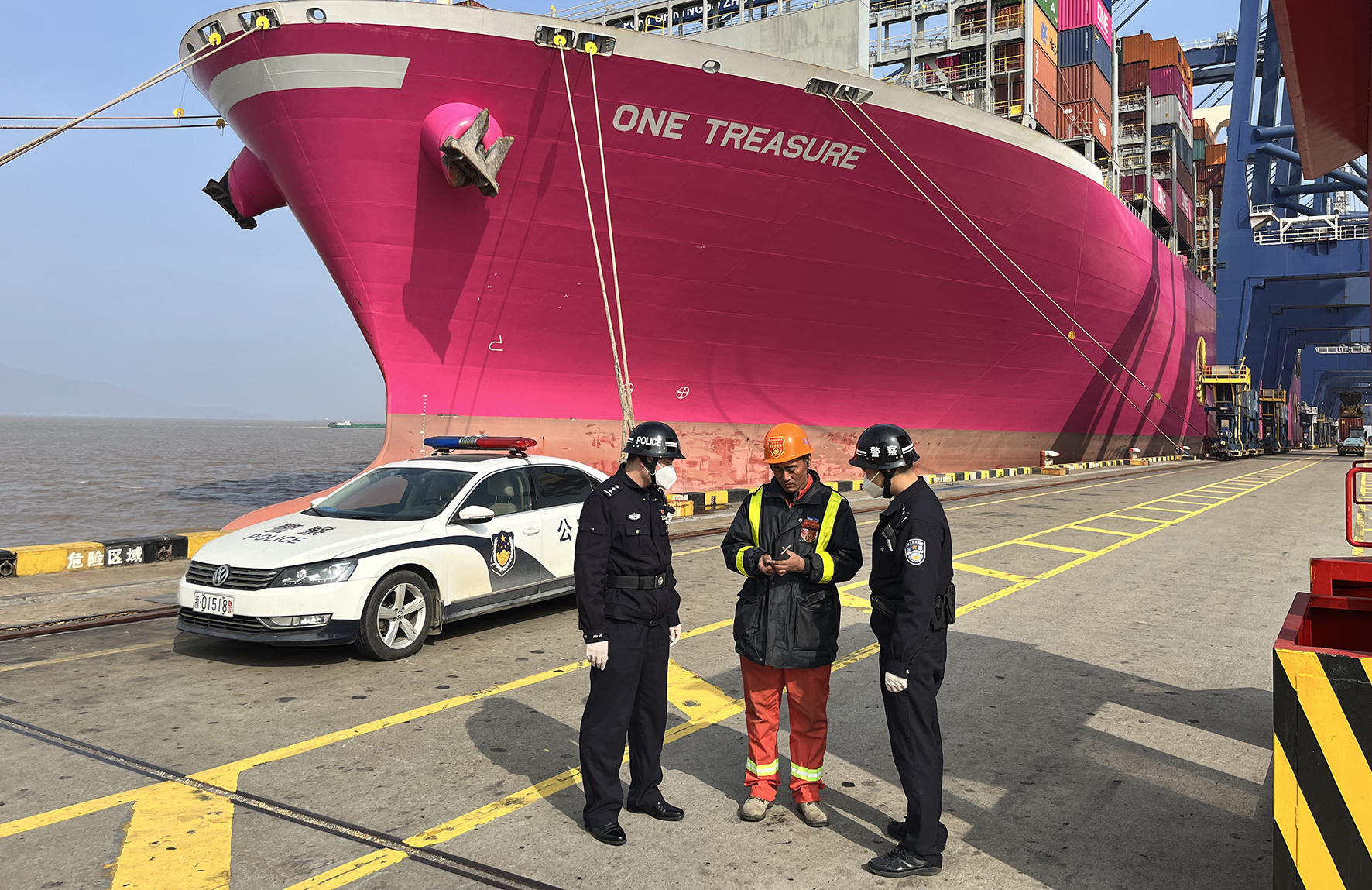 1月1日,寧波出入境邊防檢查站綜合執(zhí)勤七隊(duì)民警在大榭港區(qū)集裝箱碼頭開(kāi)展巡邏檢查。