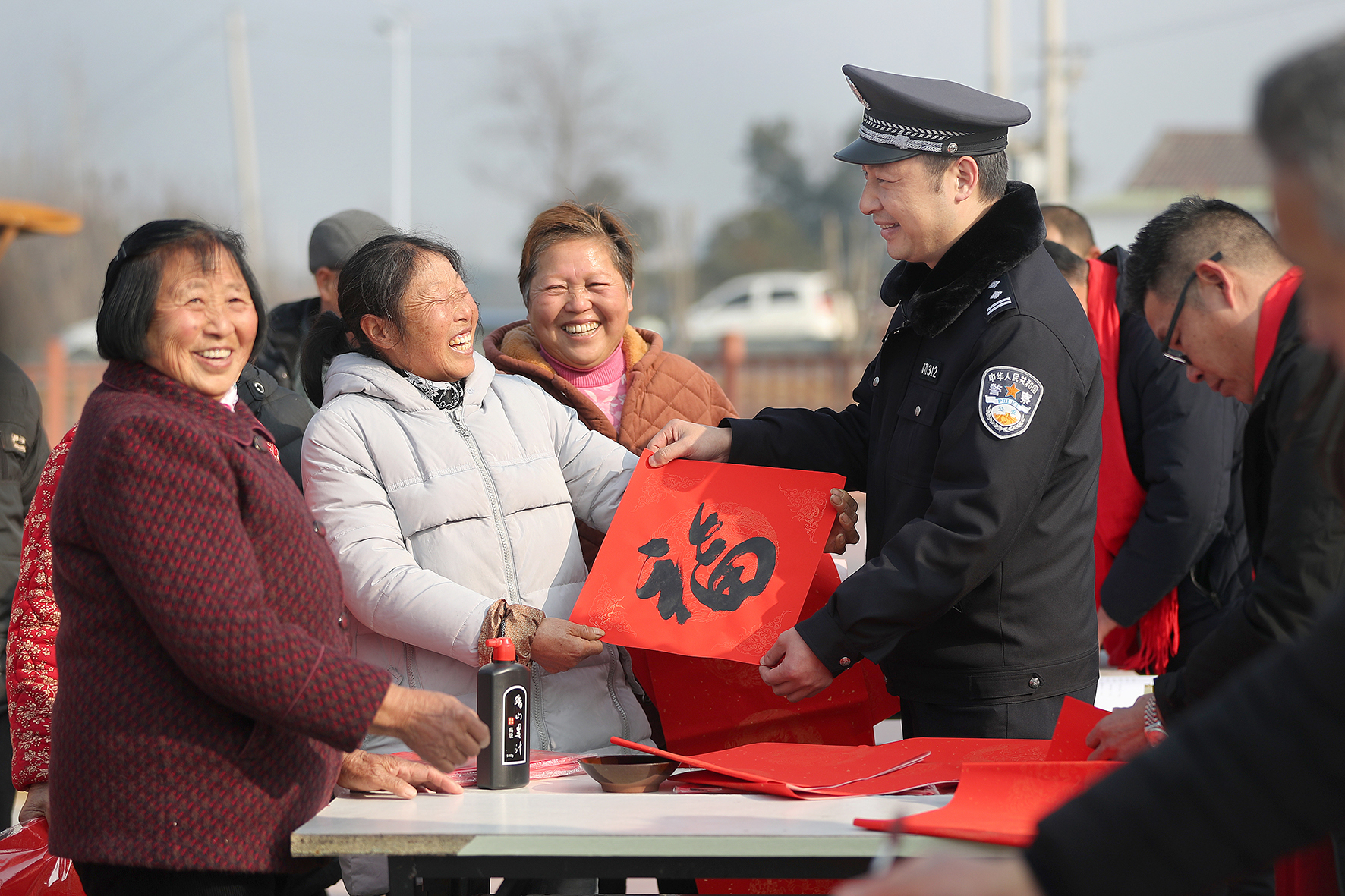 1月12日,在湖北省掇刀區(qū)團(tuán)林鋪鎮(zhèn)合星村,荊門市公安局高新區(qū)·掇刀區(qū)分局團(tuán)林派出所民警向村里老人送上“平安福”。