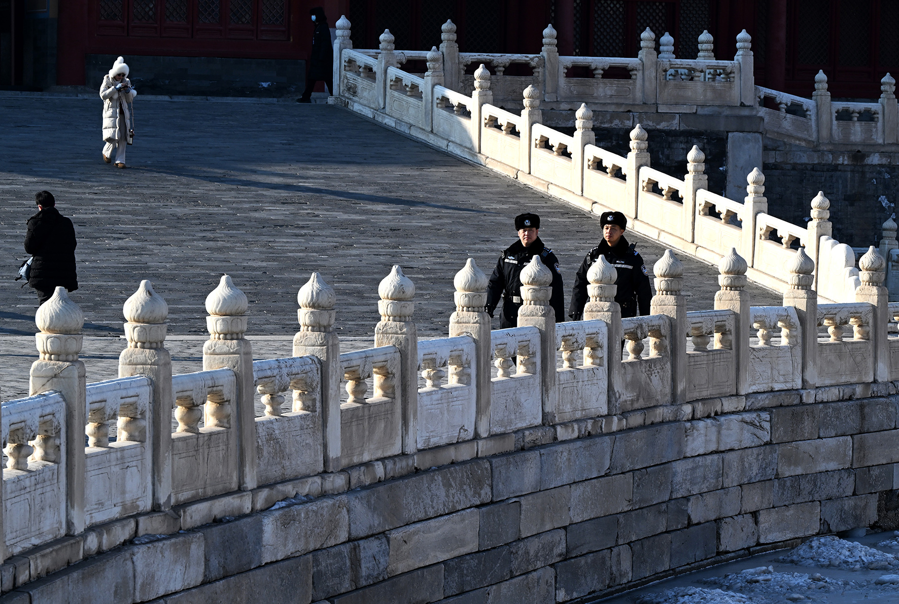 民警在午門西雁翅樓進行巡查。午門東西雁翅樓是舉辦各種文化展覽活動的場所。