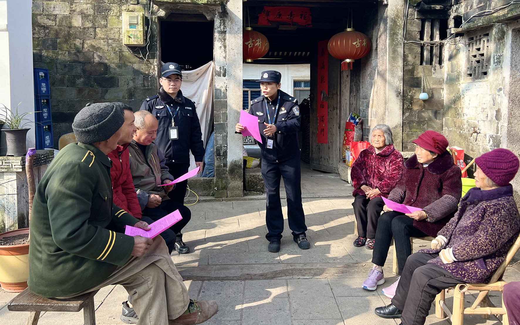 圖為1月31日,民輔警在溪頭王村普及安全防范知識(shí),解答村民提出的法律問(wèn)題。