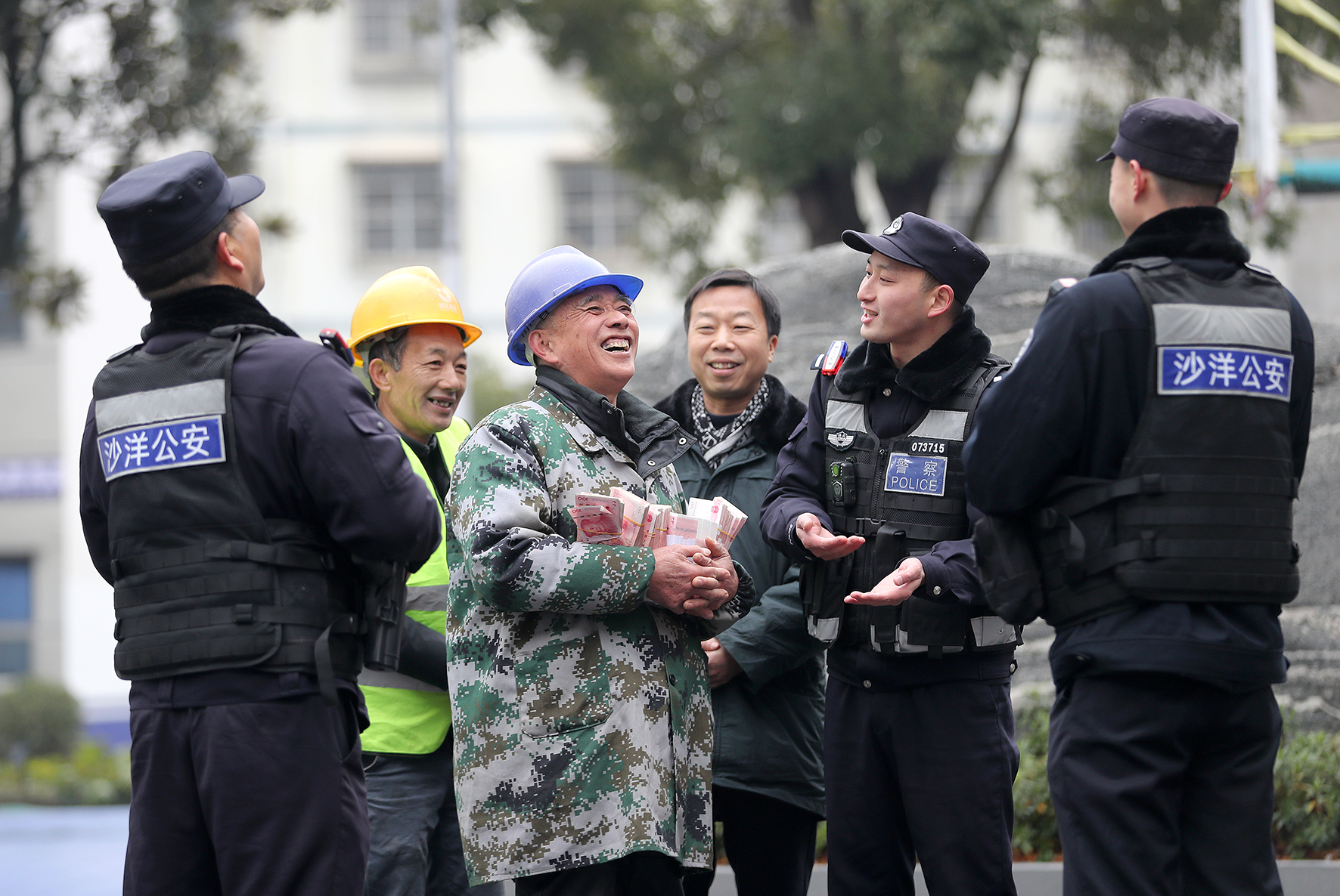 2月1日,在湖北省沙洋縣公安局紀(jì)山派出所拖欠農(nóng)民工工資發(fā)放現(xiàn)場(chǎng),16名農(nóng)民工代表拿到民警追繳回的20萬元拖欠工資,臉上喜笑開顏。