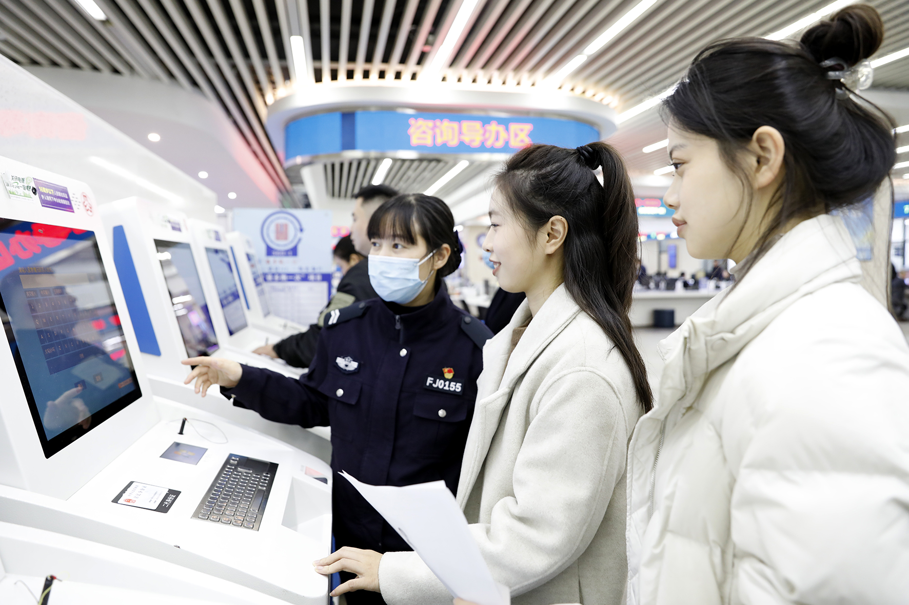 2月1日,浙江省麗水市公安局出入境管理局受理中心工作人員協(xié)助群眾在自助機(jī)填表。春節(jié)臨近,隨著出境游越來越熱,麗水市公安局出入境管理局受理中心迎來辦證高峰期。