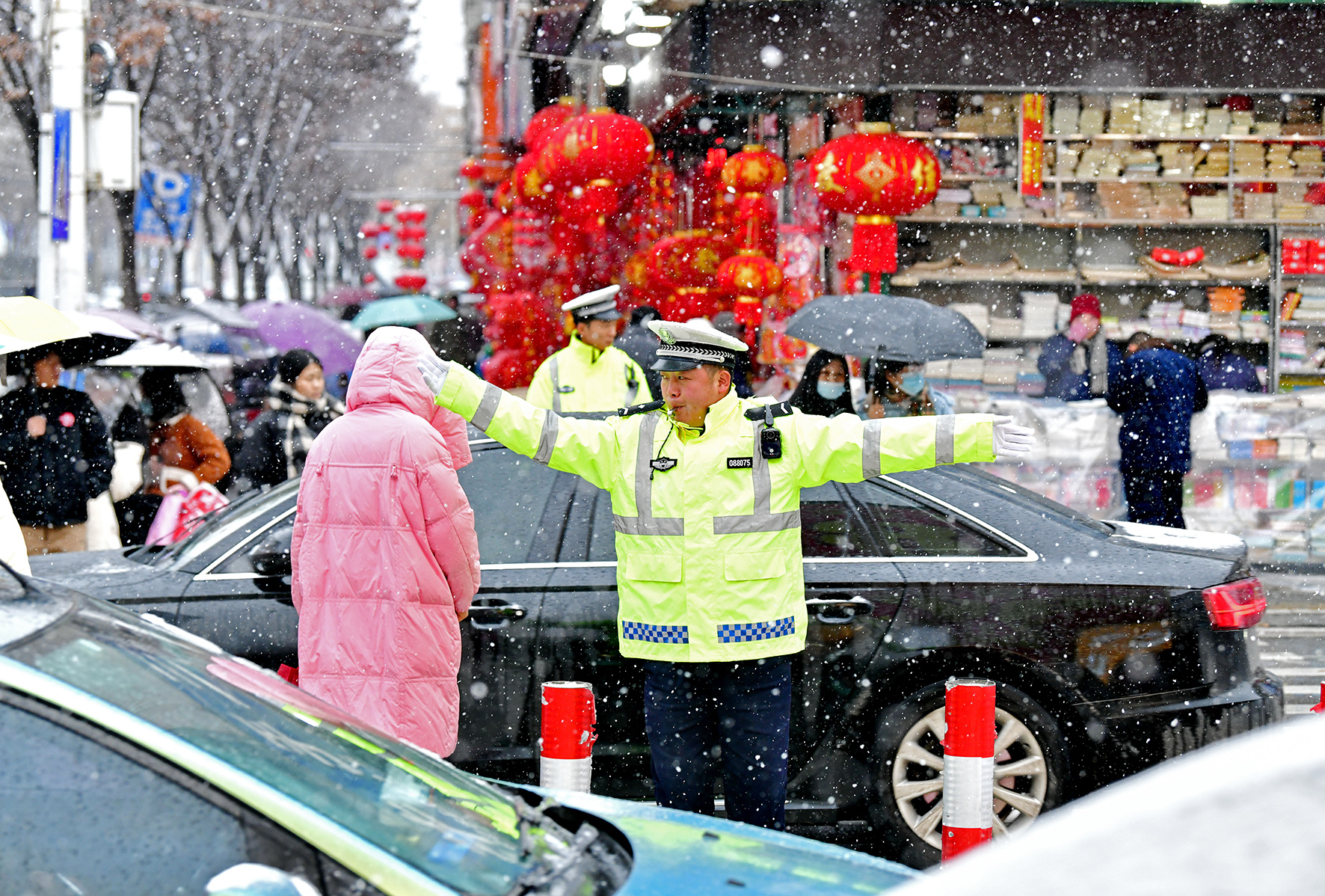 2月1日,安徽省阜南縣交警在城區(qū)年貨街路口維持交通秩序。當(dāng)日,阜南縣公安局交管大隊啟動春運雨雪惡劣天氣道路交通應(yīng)急預(yù)案,在城區(qū)主要路口設(shè)置高峰崗、國省道路段加大巡邏力度,確保群眾節(jié)日期間出行安全暢通。