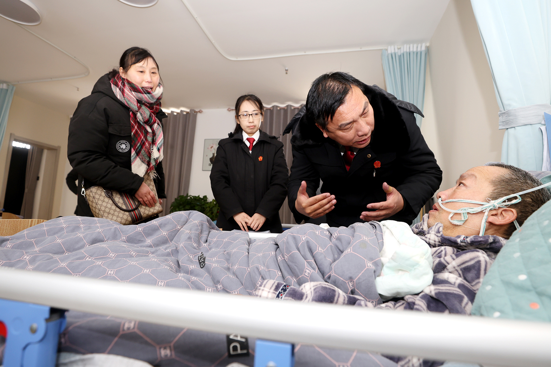 2月4日,河南省安陽(yáng)縣人民法院高莊人民法庭法官上門(mén)為因交通事故癱瘓?jiān)诖驳陌啄侈k理了立案和委托手續(xù)。