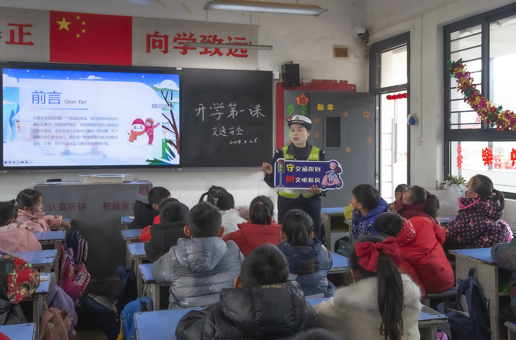 2月26日,四川省綿陽市公安局交警支隊直屬一大隊民警走進(jìn)轄區(qū)校園開展“開學(xué)第一課”交通安全宣傳活動。