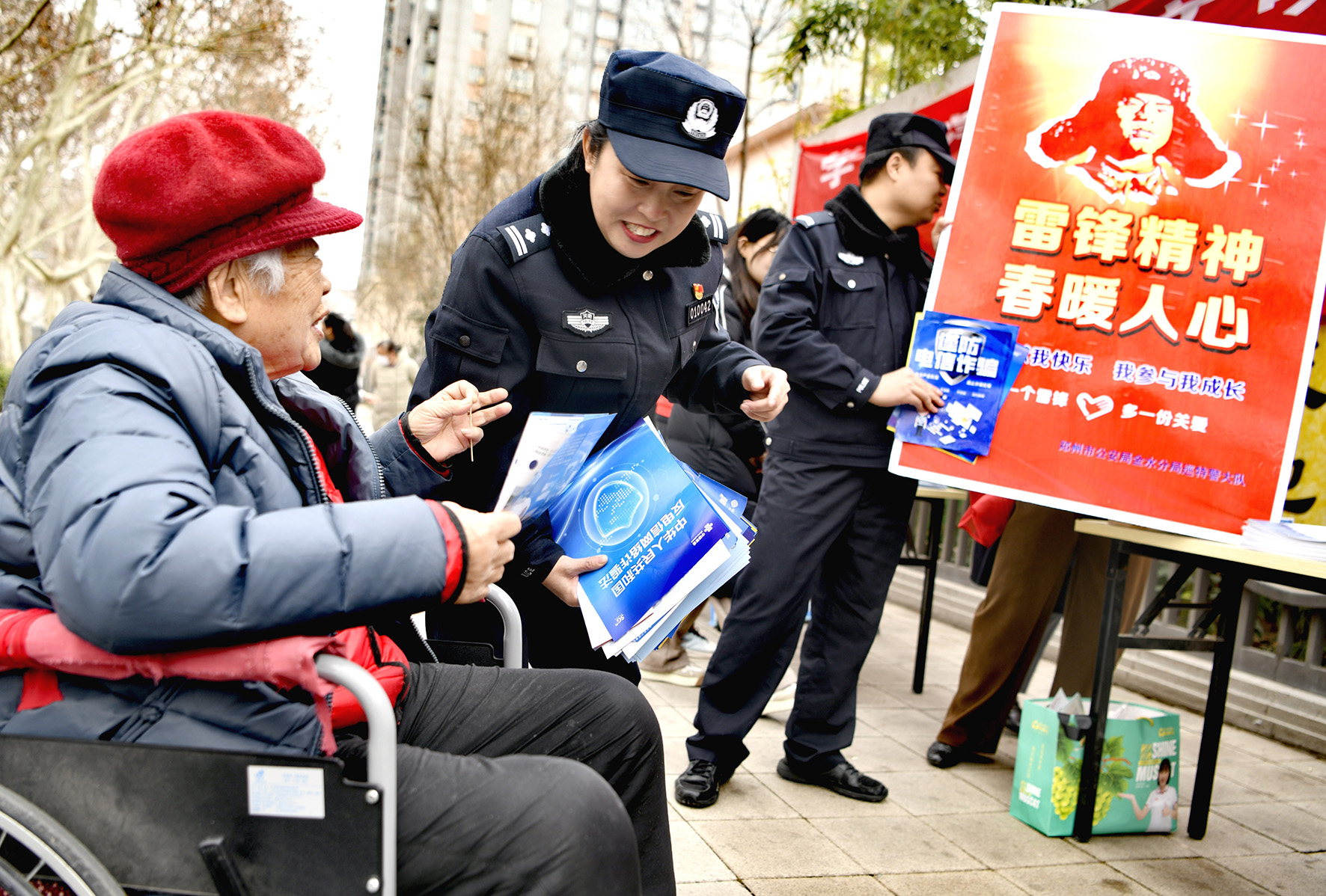 3月5日,河南省鄭州市公安局金水分局巡特警隊(duì)員來(lái)到轄區(qū)開(kāi)展“學(xué)雷鋒春暖人心”服務(wù)活動(dòng)。